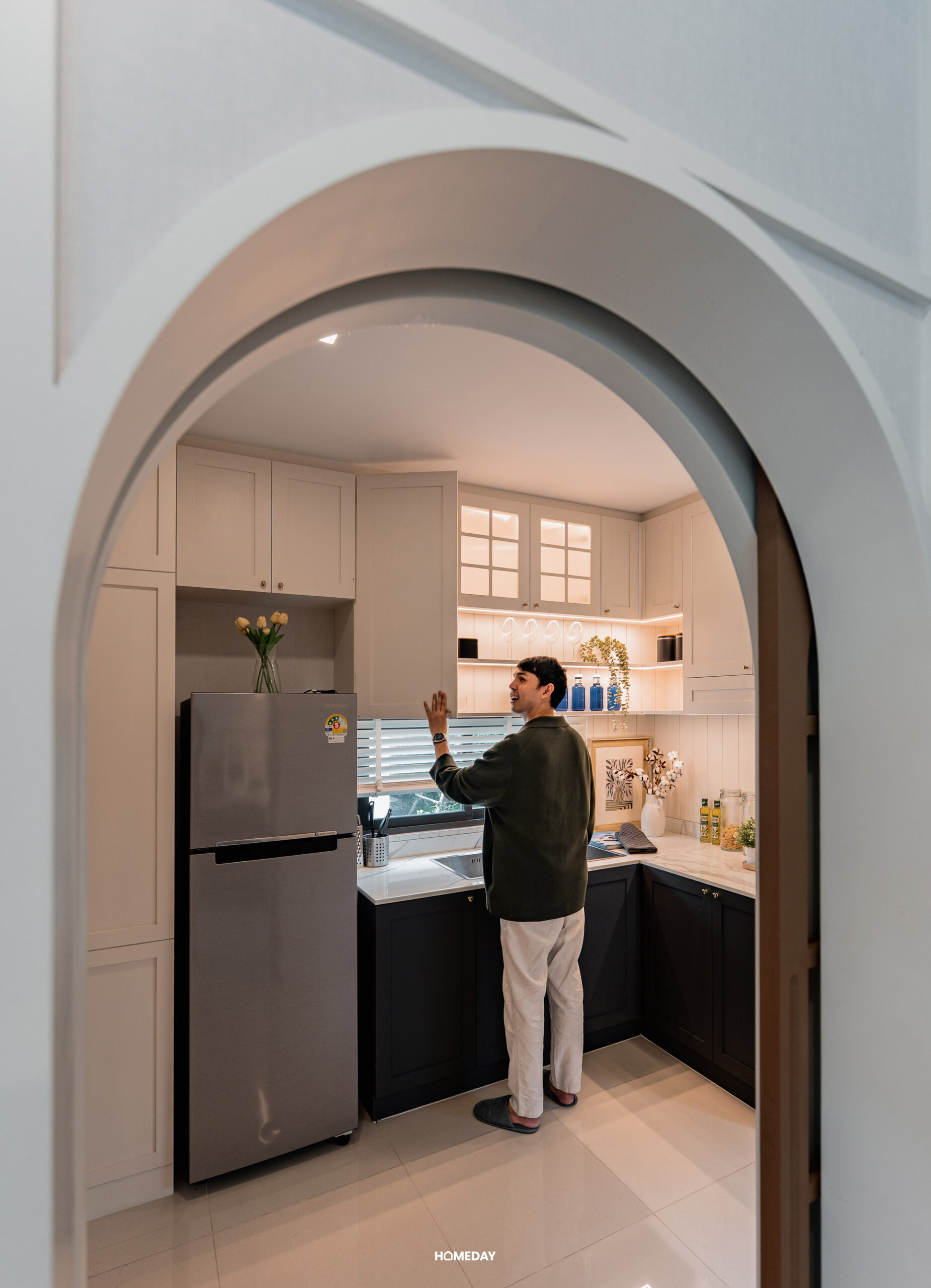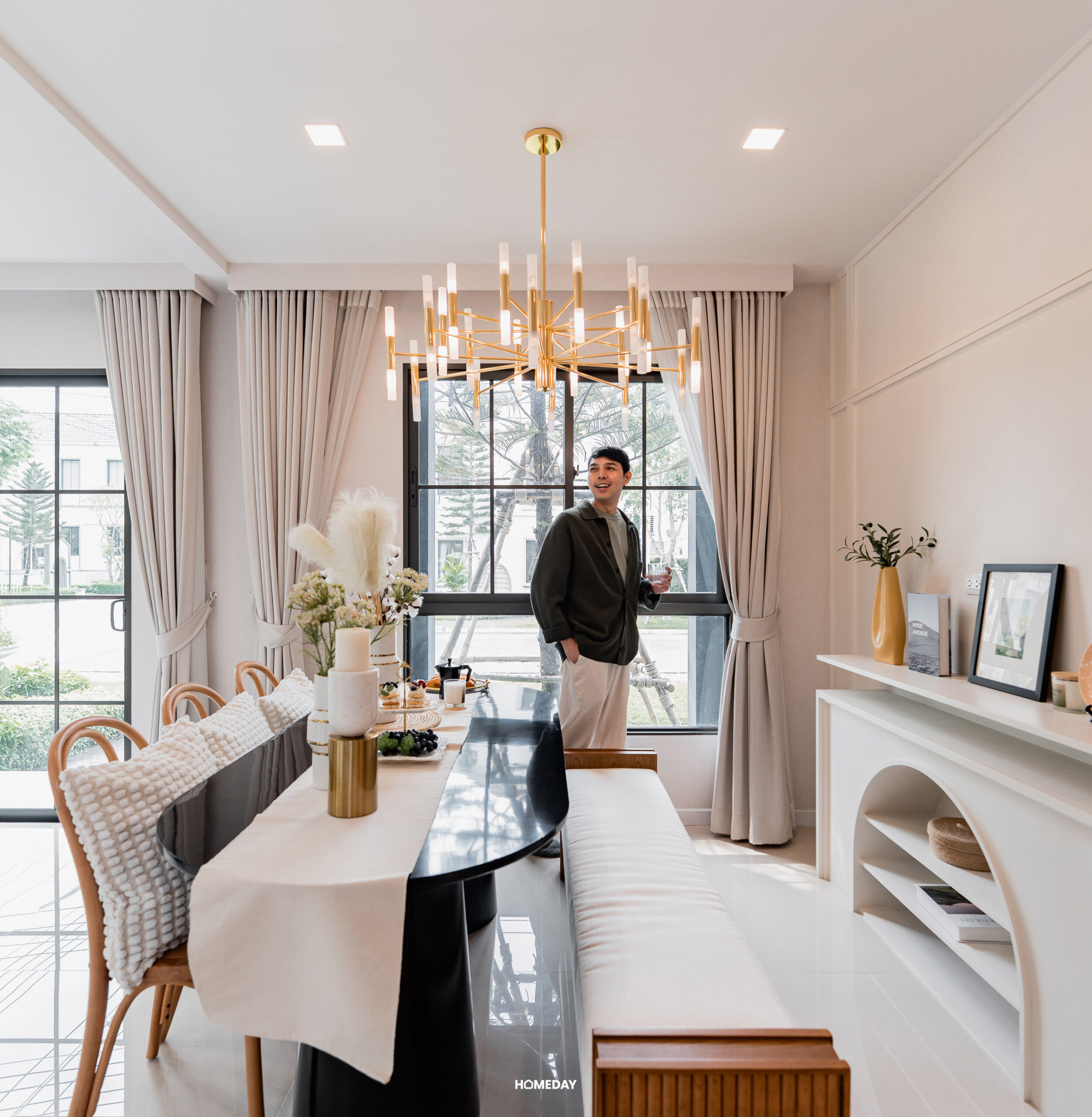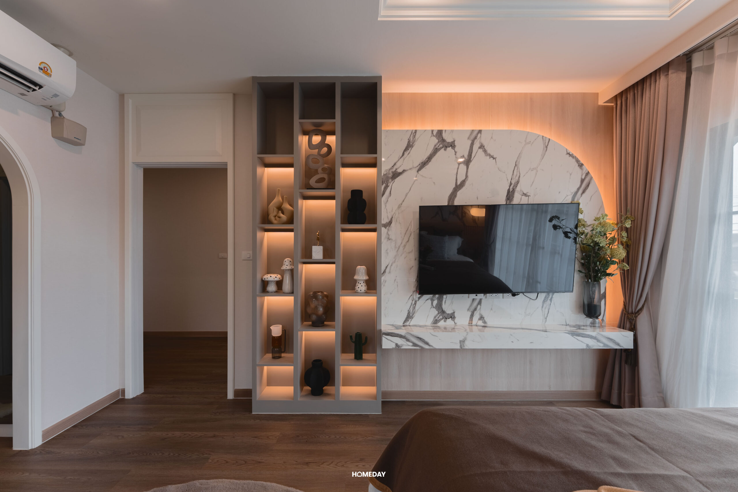 เปิดประตูเข้ามาภายในบ้านจะเจอกับ Living Area แบบ Open Plan ที่เชื่อมต่อพื้นที่ใช้งานเข้าหากันอย่างต่อเนื่อง ทำให้บรรยากาศภายในบ้านดูโปร่งและใช้งานได้สะดวก มีช่องแสงขนาดใหญ่หลายจุด ช่วยให้บ้านรับแสงธรรมชาติได้ดี ทำให้พื้นที่ภายในดูสว่าง โล่ง และน่าอยู่ตลอดทั้งวัน โซนห้องนั่งเล่นจะอยู่บริเวณหน้าบ้าน ได้พื้นที่ค่อนข้างกว้าง สามารถวางโซฟาขนาด 3-4 ที่นั่ง พร้อมโต๊ะกลางสำหรับวางเครื่องดื่มหรือของทานเล่นในระหว่างพักผ่อนหรือดูทีวีได้สบาย ฝั่งตรงข้ามเป็นผนังแนวยาวที่สามารถวางชั้นวางทีวี หรือจะ Built-in เป็นตู้โชว์และชั้นเก็บของขนาดใหญ่ก็ทำได้ บริเวณนี้มีการเตรียม ปลั๊กไฟ, USB Port และจุด Cable TV มาให้พร้อมใช้งาน ระยะระหว่างโซฟาและผนังทีวีค่อนข้างกว้าง ทำให้สามารถวางทีวีจอใหญ่และนั่งดูได้ในระยะที่สบายตา อีกทั้งยังเหลือพื้นที่ให้เดินเชื่อมไปยังส่วนอื่นของบ้านได้อย่างสะดวก