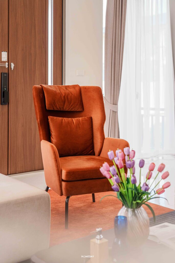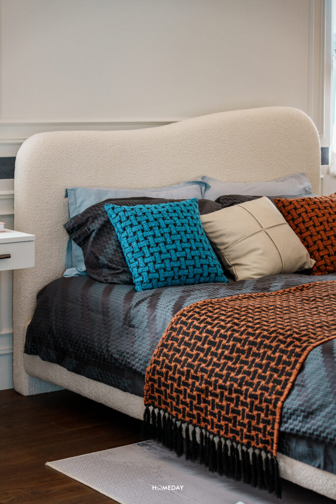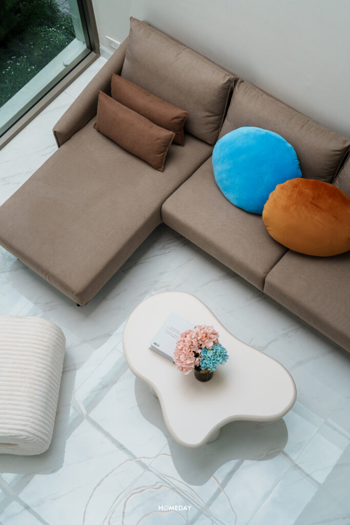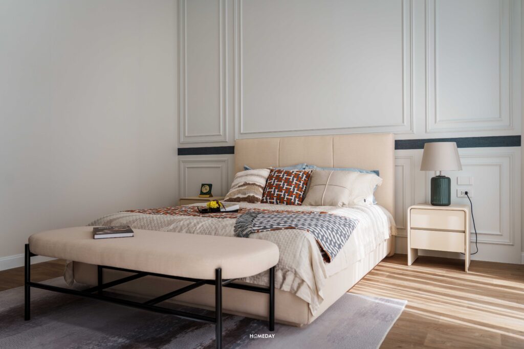 บริเวณปลายเตียงยังมีพื้นที่เหลือกว้างเลยครับ สามารถวางโซฟาเบดหรือโซฟาขนาด 2 ที่นั่ง ไว้นั่งดูทีวีได้สบาย ๆ จะดูซีรีส์ก่อนนอน หรือนั่งพักผ่อนอ่านหนังสือก็เหมาะมาก