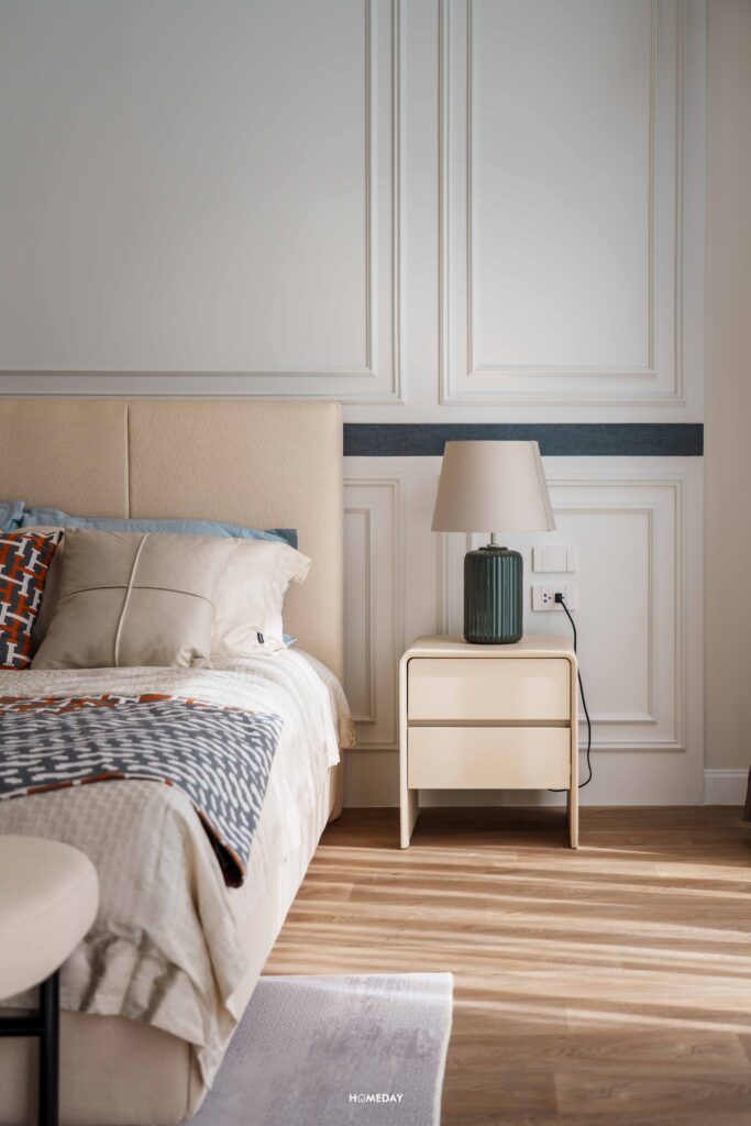 พื้นที่ว่างสองฝั่งข้างเตียงของห้องนี้ สามารถปรับฟังก์ชันได้ตามความต้องการเลยครับ จะทำเป็นมุมทำงานเล็ก ๆ หรือ โต๊ะเครื่องแป้งก็ได้ทั้งคู่ ตำแหน่งลงตัวและยังรับแสงธรรมชาติจากหน้าต่างได้ดี ส่วนอีกด้านของห้องสามารถ Built-in ตู้เสื้อผ้าแบบ Walk-in Closet ได้ตรงหน้าห้องน้ำพอดี ช่วยให้การแต่งตัวและใช้งานในชีวิตประจำวันสะดวกขึ้น ดูเป็นระเบียบและใช้พื้นที่ได้คุ้มมาก ๆ ครับ