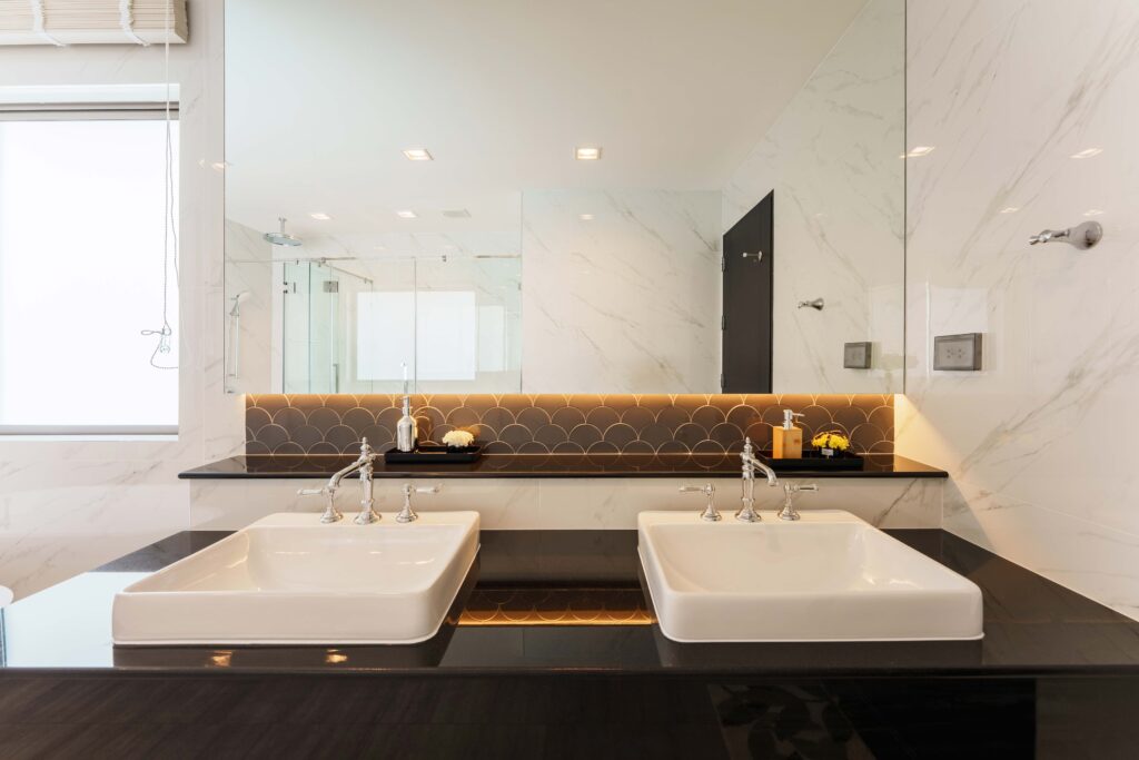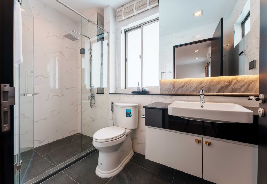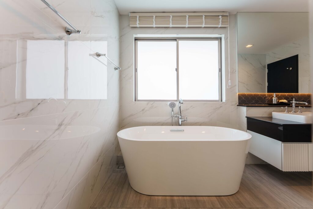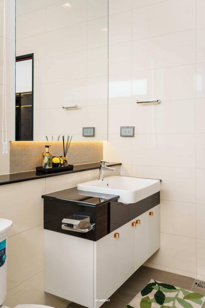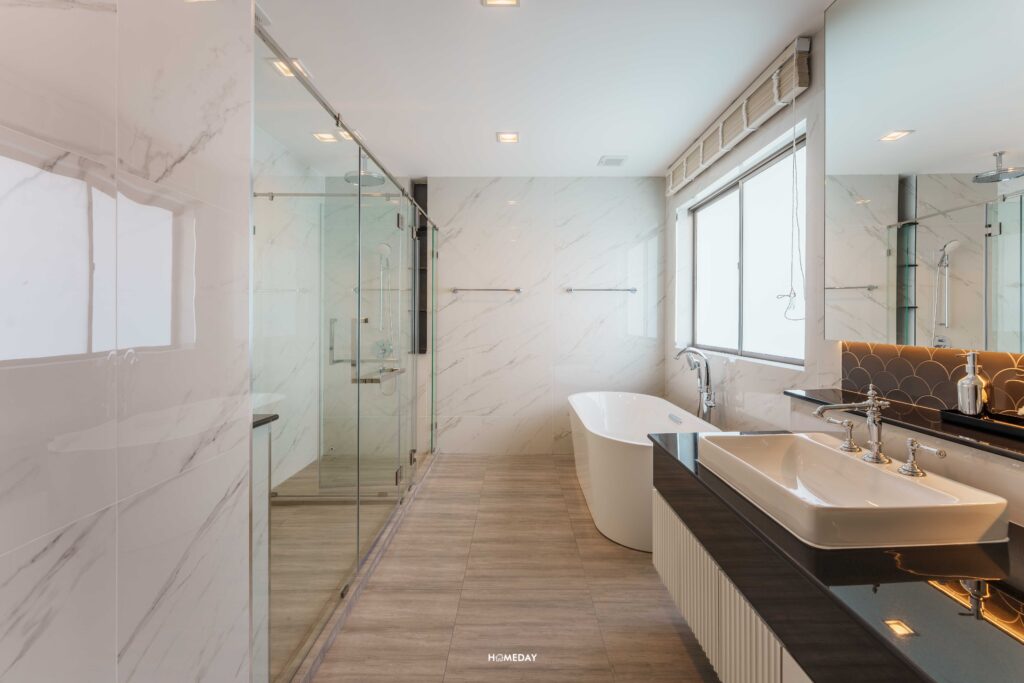 จุดเด่นคือเฉพาะห้องนี้จะได้ทั้งอ่างล้างหน้าแบบ His & Her แยกสองฝั่ง ใช้งานพร้อมกันได้สบาย และ อ่างอาบน้ำแบบลอยตัว (Freestanding Bathtub) และหน้าต่างบานเลื่อนขนาดใหญ่ 1 บาน ช่วยรับแสงธรรมชาติและระบายอากาศ แต่ก็มีพัดลมระบายอากาศมาให้อีกเช่นกันครับ