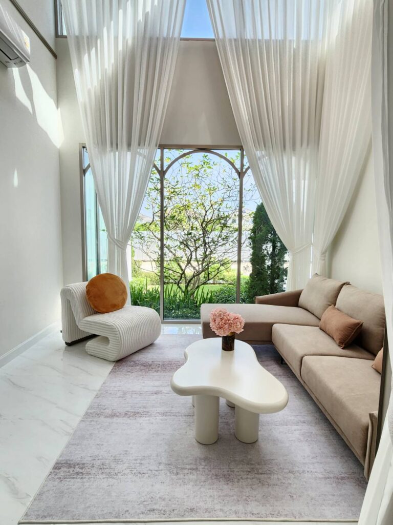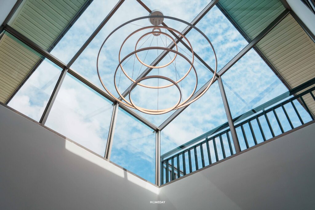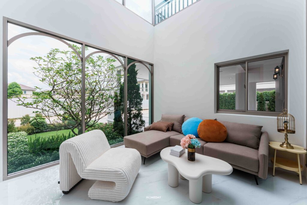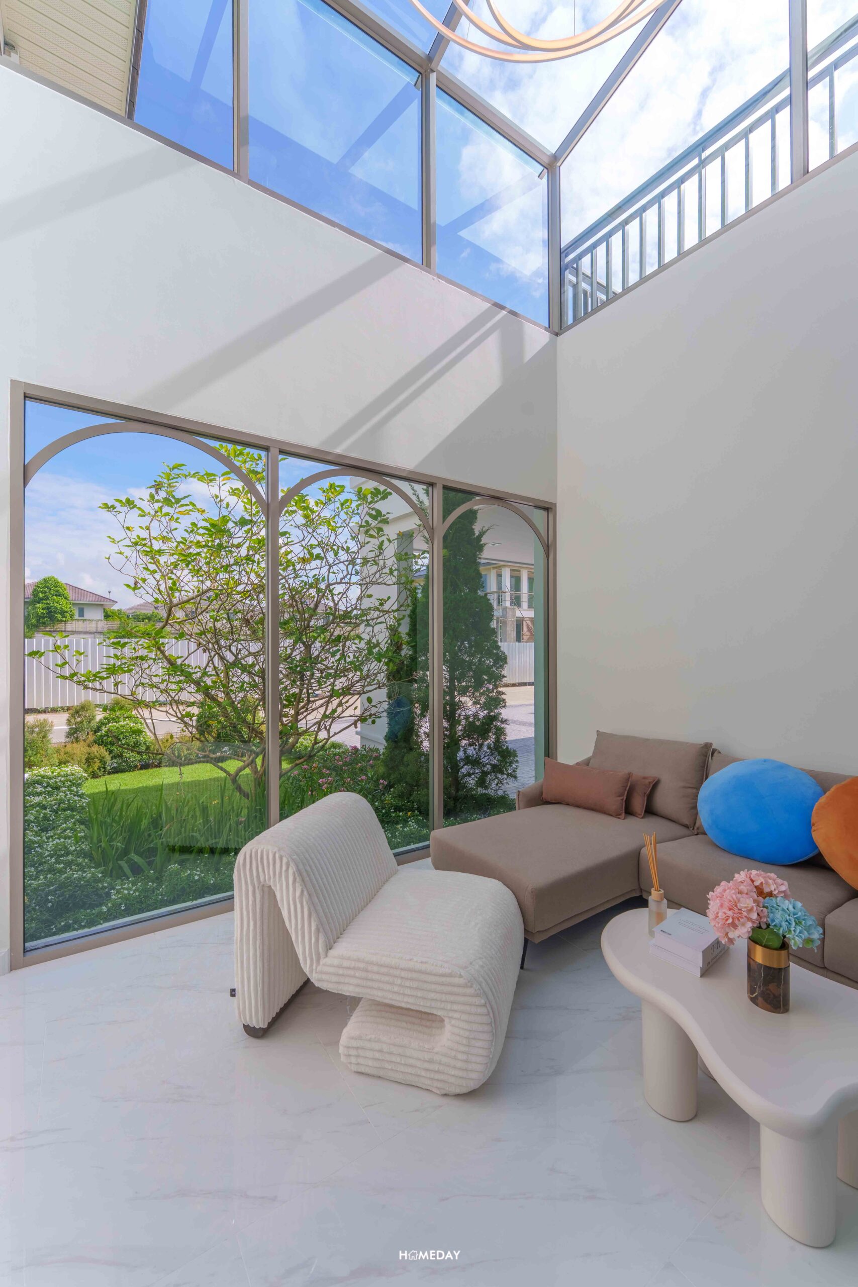 เดินเข้ามาด้านในอีกหน่อย จะเจอกับโซนไฮไลต์ของบ้านเลยครับ Private Living Room ที่ออกแบบแบบ Double Volume สูงเกือบ 7 เมตร ให้ความรู้สึกโปร่ง โล่ง และสบายตาสุด ๆ ตรงนี้ดีไซน์หลังคาแบบ Glass House ที่เปิดรับแสงธรรมชาติได้เต็มที่ มองออกไปเห็นวิวสวนหน้าบ้านแบบพาโนรามาเลยครับ เป็นมุมที่อยู่แล้วรู้สึกผ่อนคลาย เหมาะจะเป็นศูนย์รวมของคนในบ้าน ไม่ว่าจะใช้เป็นมุมนั่งเล่นยามเช้า มุมอ่านหนังสือ หรือถ้าใครสายสุขภาพจะปรับเป็น Gym Room ก็ได้ หรือจะทำเป็น Pet Room ให้สัตว์เลี้ยงมีพื้นที่ส่วนตัวก็น่ารักไม่แพ้กันครับ