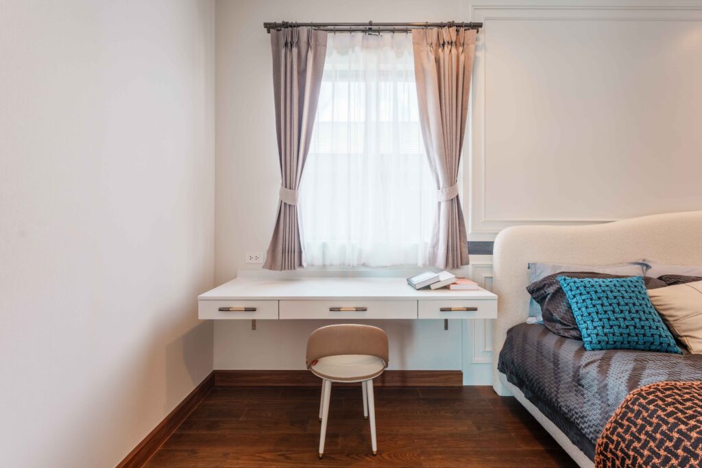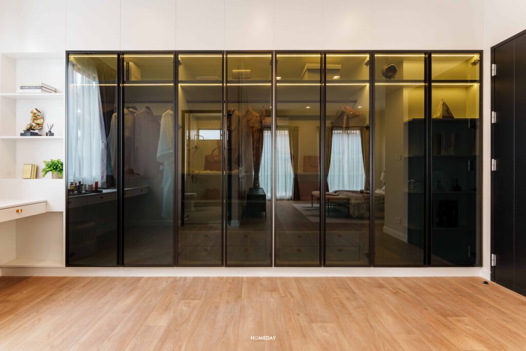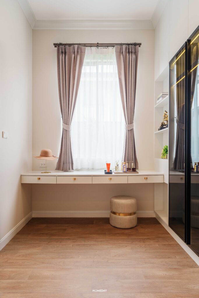 บริเวณหน้าห้องน้ำ สามารถ Built-in ตู้เสื้อผ้ายาว ๆ ได้ตามไอเดียในบ้านตัวอย่างเลยครับ จะเลือกแบบบานเปิดหรือบานเลื่อนก็ได้ พื้นที่ตรงนี้จัดสเปซได้พอดี ดูเรียบร้อยและใช้งานได้จริง ถัดมาเป็นมุมโต๊ะเครื่องแป้งที่อยู่ติดหน้าต่าง ตำแหน่งนี้ถือว่าลงตัวมากครับ เพราะได้แสงธรรมชาติส่องเข้ามาโดยตรง ช่วยให้แต่งหน้าหรือเตรียมตัวในตอนเช้าได้สะดวกขึ้น แถมยังช่วยให้บรรยากาศในห้องดูโปร่งและสดชื่นด้วยครับ