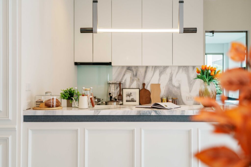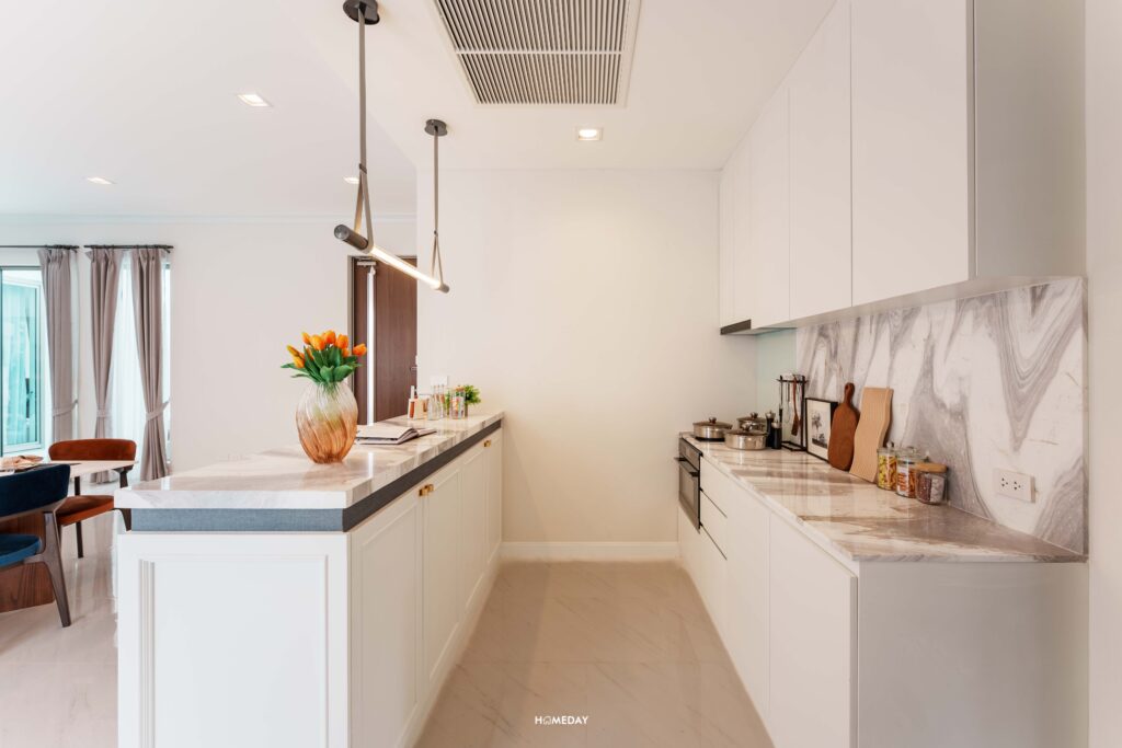 กลับมาดูที่โซน Pantry ครัวฝรั่งกันครับ ตรงนี้จะเป็นมุมเบา ๆ สไตล์ Bakery Zone เหมาะสำหรับทำขนม อุ่นอาหาร หรือเตรียมเครื่องดื่มในชีวิตประจำวันได้สะดวก พื้นที่เคาน์เตอร์กว้าง สามารถติดตั้งเตาไฟฟ้า เตาอบ และตู้เก็บของไว้ด้านบน ได้ตามแบบบ้านตัวอย่างเลยครับ ดูเรียบหรูและใช้งานได้จริง ติดกันเป็นประตูทางเข้าห้องครัวไทย แยกออกไปอีกชั้นหนึ่ง ซึ่งเป็นประตูบานเปิด ปิดมิดชิด กันกลิ่นจากการทำอาหารไม่ให้เข้ามาในโซนรับประทานอาหารหรือพื้นที่ส่วนกลางได้ดี เหมาะกับบ้านที่ชอบทำอาหารไทยหรืออาหารกลิ่นแรงครับ