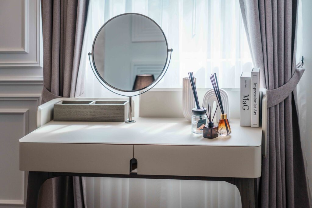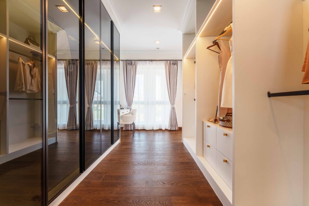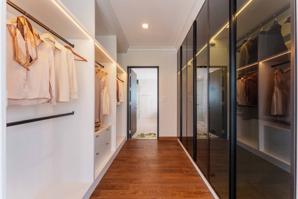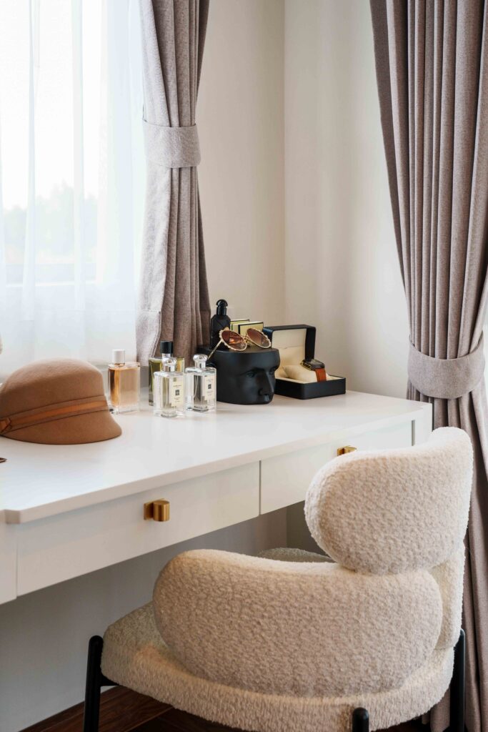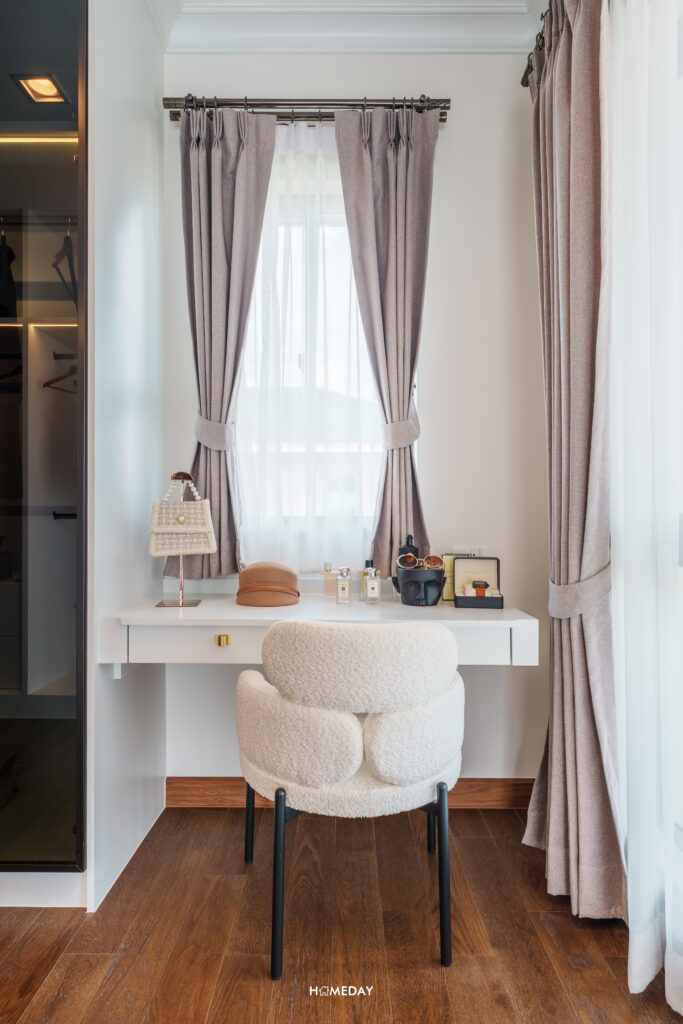 โซน Walk-in Closet จะอยู่ด้านในสุด บริเวณหน้าห้องน้ำครับ พื้นที่ตรงนี้จัดฟังก์ชันได้ครบ สามารถวาง โต๊ะเครื่องแป้ง ติดหน้าต่างได้พอดี ได้แสงธรรมชาติส่องเข้ามาเต็มที่ ช่วยให้แต่งหน้า แต่งตัวตอนเช้าได้สะดวก หรือถ้าอยากเพิ่มความหรูหน่อย ก็สามารถติดตั้ง กระจกพร้อมไฟแต่งหน้าได้เลยครับ