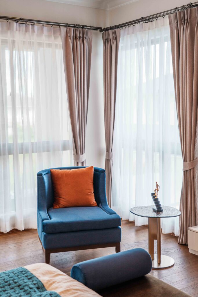 มุมนี้ที่เห็นจากชั้น 2 ก็คือพื้นที่ Double Volume ของโซน Private Living Room ด้านล่างครับ มองลงไปแล้วจะเห็นเลยว่าพื้นที่ตรงนี้สูงโปร่งมาก แสงธรรมชาติจากกระจกด้านหน้าและด้านข้างส่องขึ้นมาถึงชั้นบนได้เต็มที่ ทำให้บรรยากาศของชั้น 2 ดู สว่าง โล่ง และอบอุ่นไปพร้อมกันครับ เป็นดีไซน์ที่ช่วยเชื่อมทั้งสองชั้นให้รู้สึกเป็นหนึ่งเดียวกันได้ดีเลย