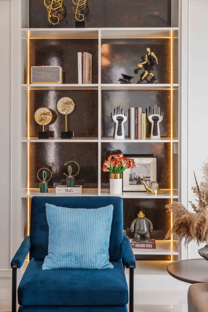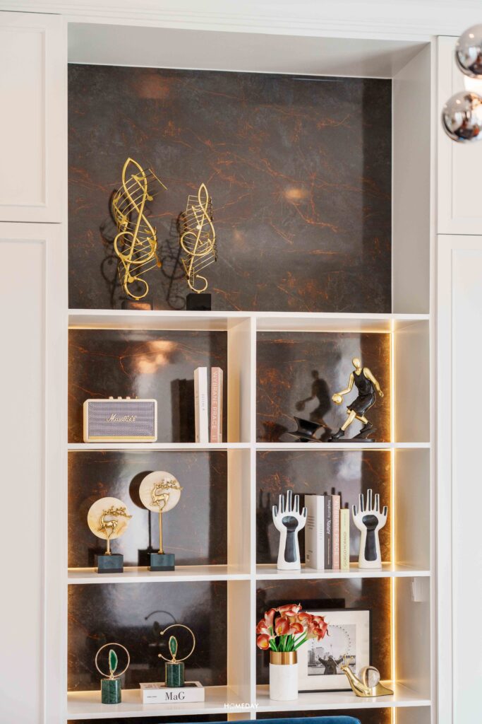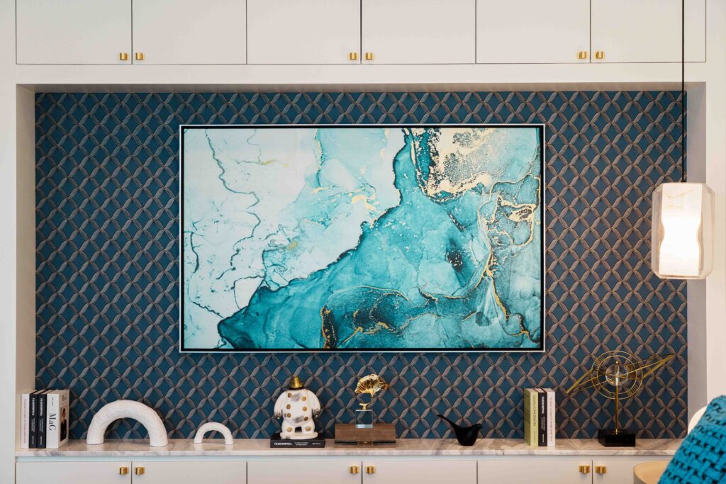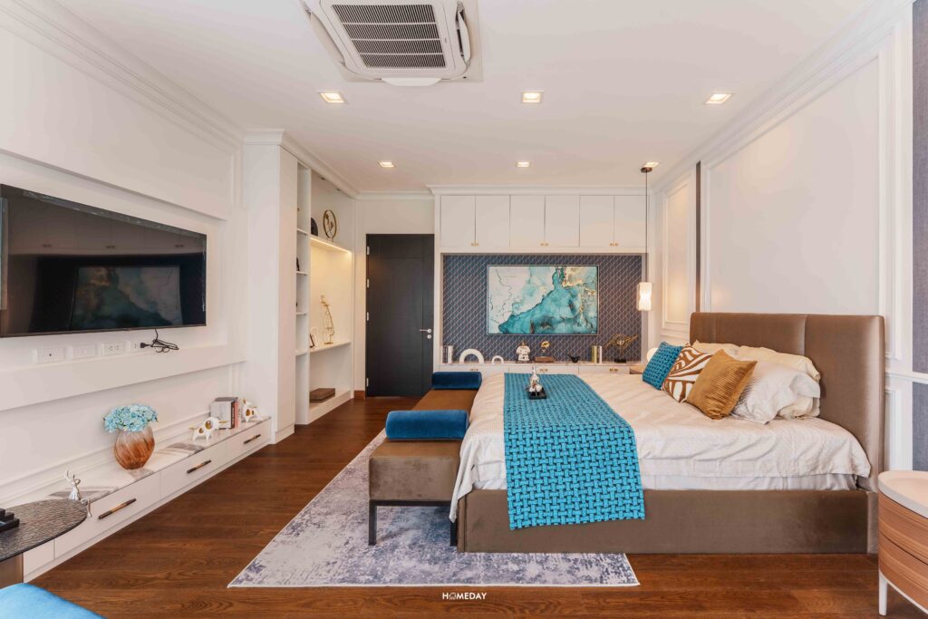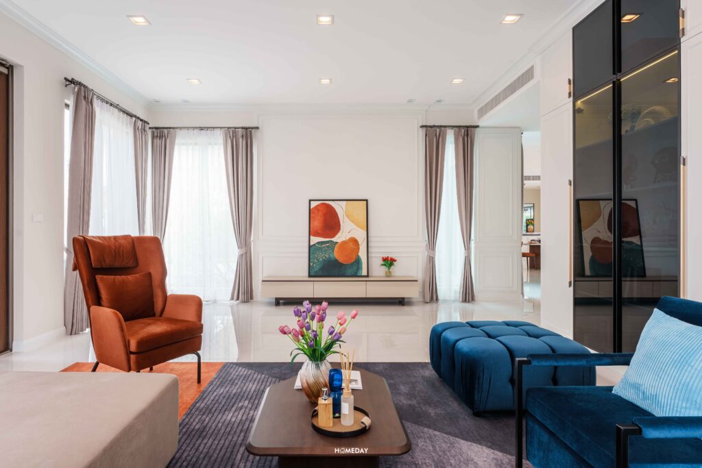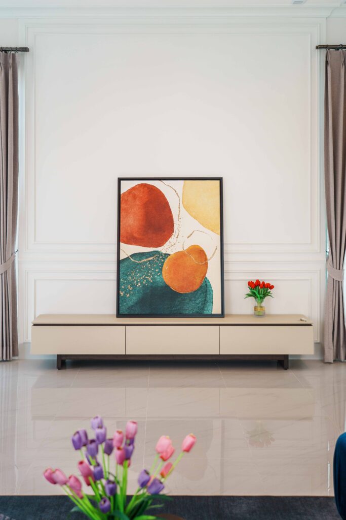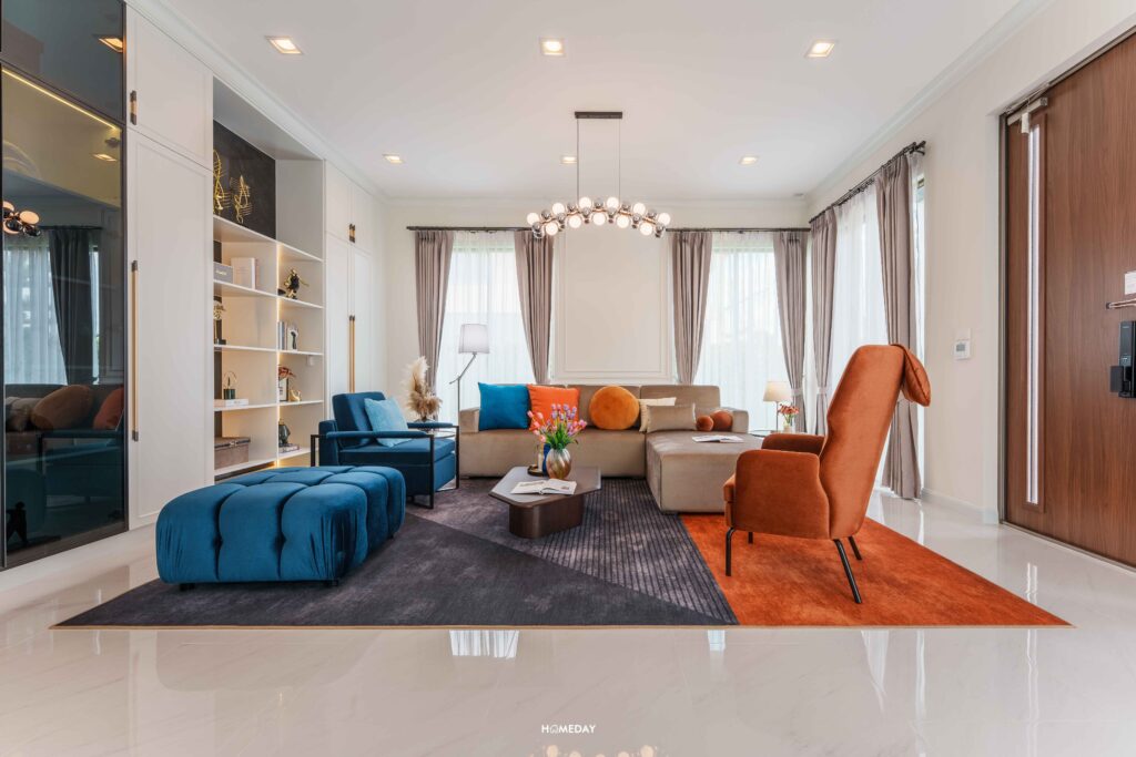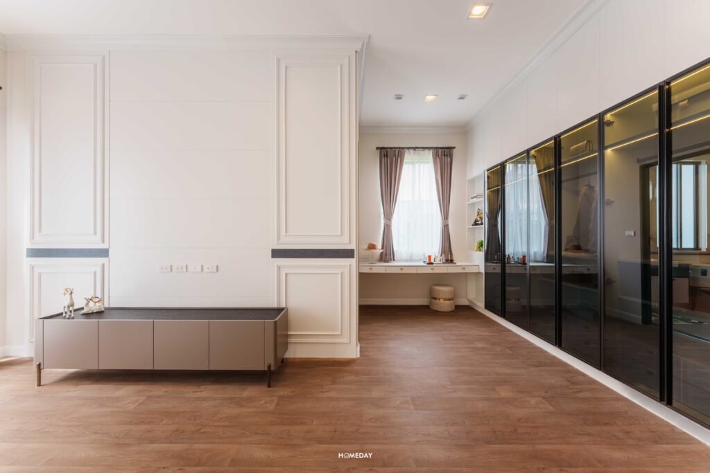 อีกด้านของห้องสามารถติดตั้ง โต๊ะวางทีวีขนาดใหญ่ ได้แบบไม่อึดอัดครับ หรือถ้าใครอยากเพิ่มฟังก์ชันให้ดูหรูขึ้น ก็สามารถ Built-in เป็นตู้โชว์ของสะสม หรือวางของตกแต่งต่าง ๆ ได้ด้วย พื้นที่ตรงนี้ออกแบบมาให้ยืดหยุ่น ปรับได้ตามไลฟ์สไตล์ของแต่ละบ้านเลยครับ จะใช้เป็นมุมดูทีวีของครอบครัว หรือมุมโชว์ของที่รักก็ลงตัว