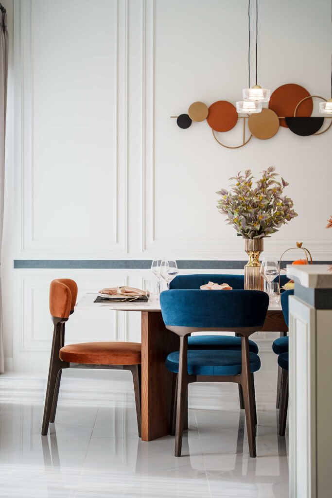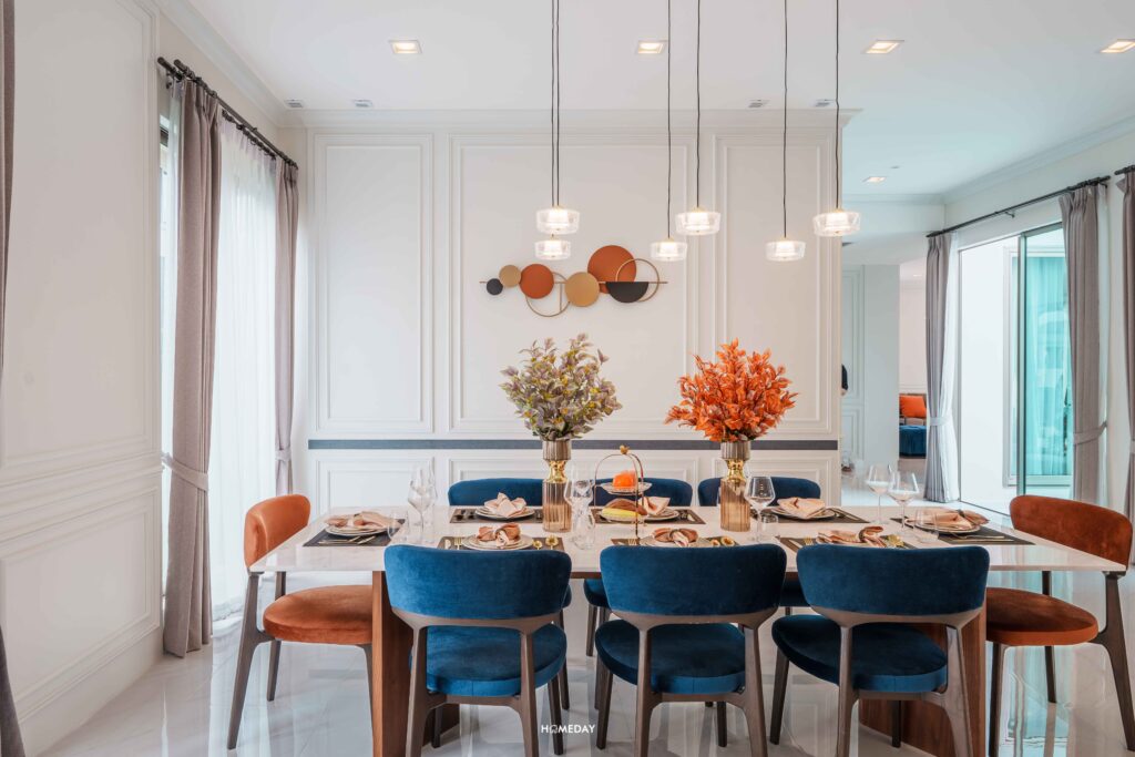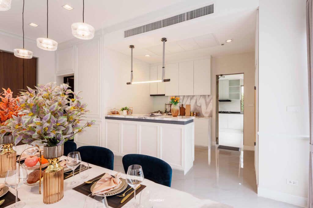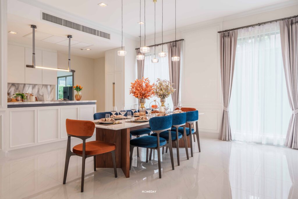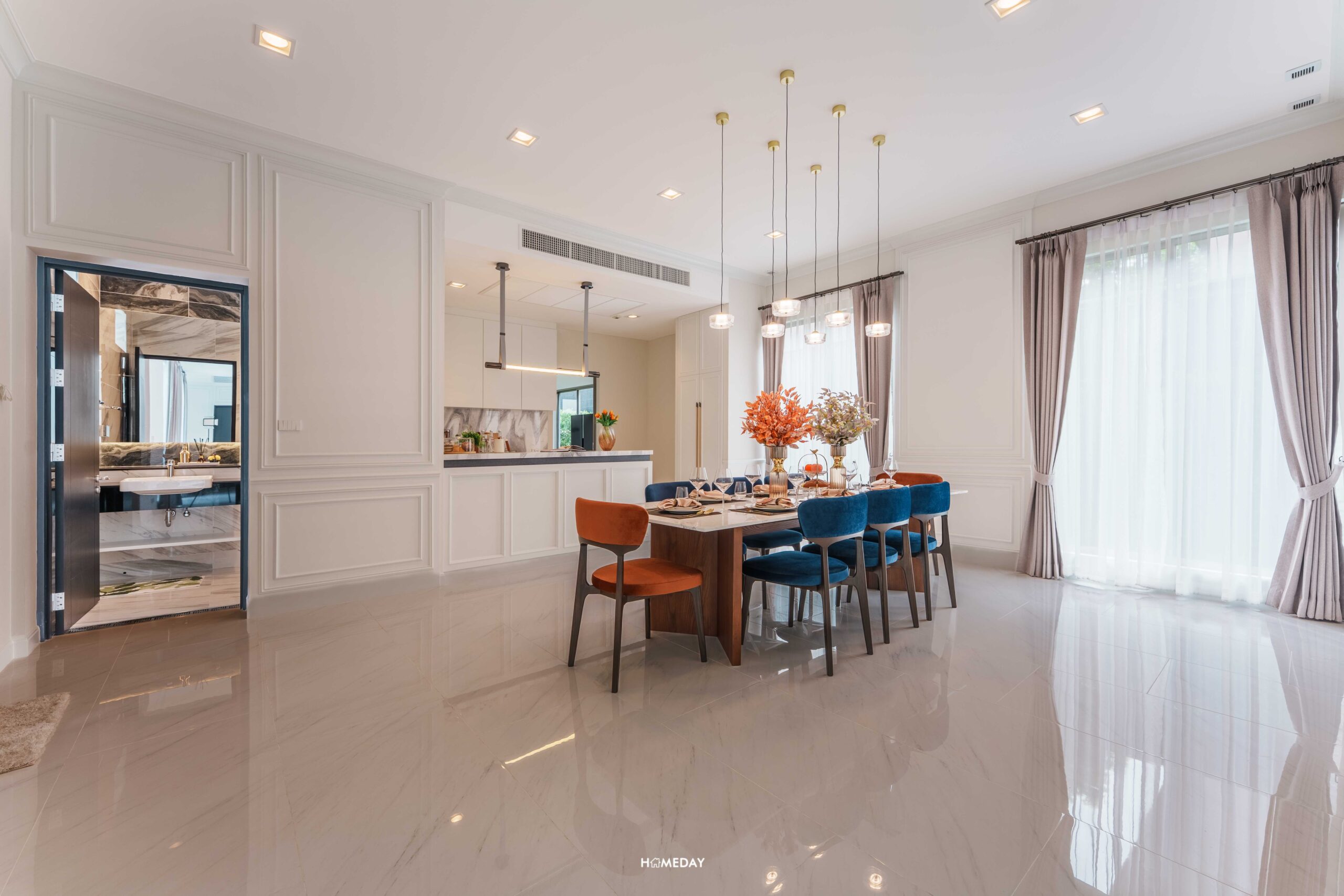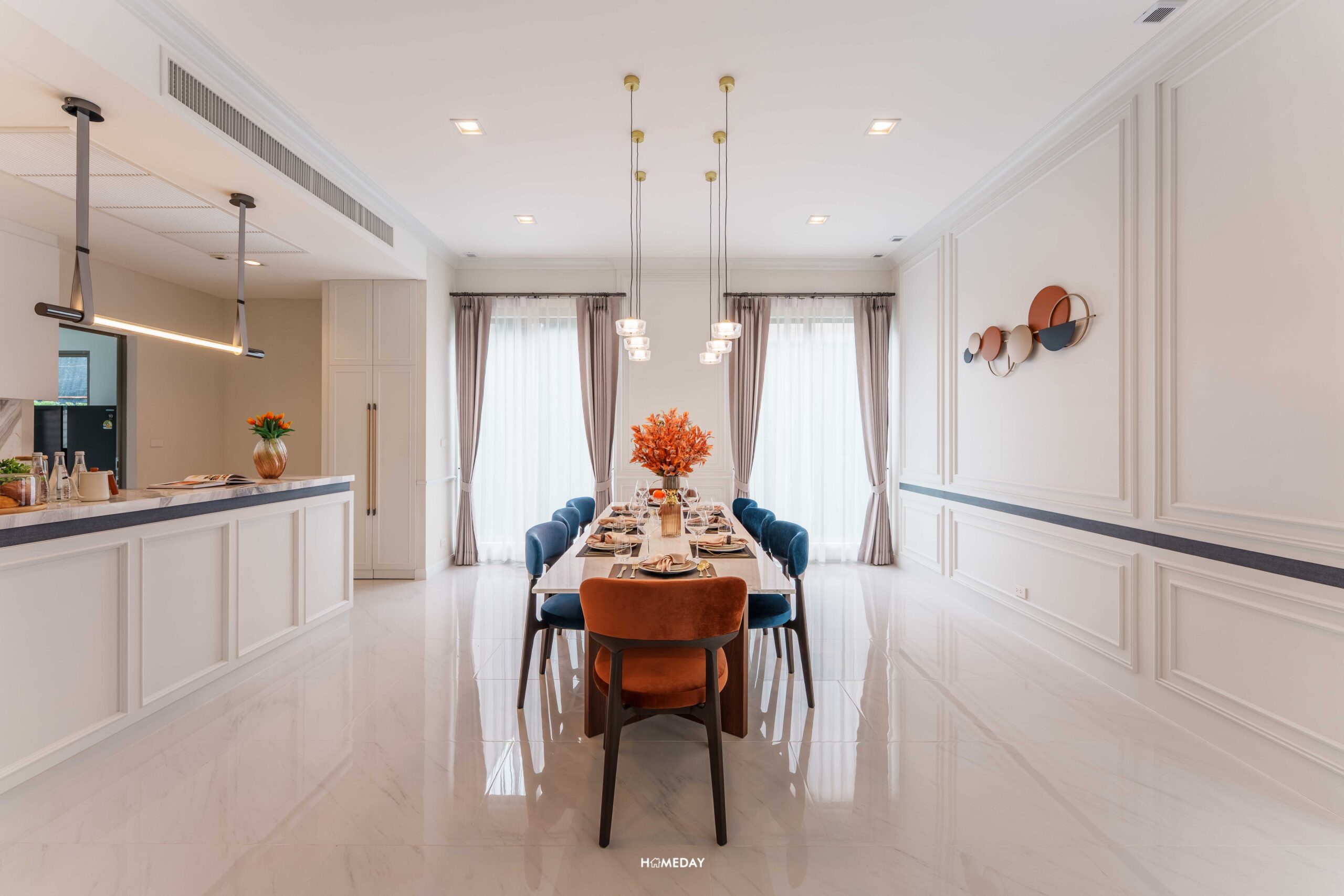 โซน Dining Room เป็นอีกพื้นที่ที่ผมชอบมากครับ เพราะออกแบบมาโปร่ง โล่ง และกว้างขวางสุด ๆ เหมาะกับบ้านที่ชอบจัดเลี้ยงหรือทำกิจกรรมร่วมกันในครอบครัว พื้นที่ตรงนี้สามารถจัดโต๊ะแบบ Long Table ขนาด 12 ที่นั่ง ได้สบาย ๆ แถมยังเหลือพื้นที่รอบโต๊ะให้เดินได้สะดวก ถ้าใครชอบบรรยากาศแบบปาร์ตี้เล็ก ๆ ก็สามารถ จัด Island หรือเคาน์เตอร์บาร์เก๋ ๆ เพิ่มเติมได้เลยครับ เป็นมุมที่เหมาะทั้งทำอาหารเบา ๆ หรือเสิร์ฟเครื่องดื่มระหว่างสังสรรค์กับเพื่อนฝูง ส่วนด้านหลังของห้องจะเชื่อมต่อกับ Terrace หลังบ้าน ที่สามารถจัดเป็นโซนบาร์บีคิวแบบ Outdoor ได้อีกด้วย เปิดประตูออกไปก็เปลี่ยนบรรยากาศได้ทันที ส่วนหน้าห้องครัวเองก็ยังมี Pantry ครัวฝรั่งจัดมาให้อีกมุม ใช้งานได้จริงและดูดีครบทุกฟังก์ชันครับ