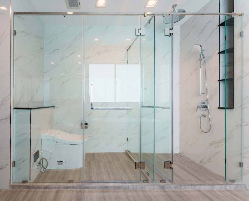 ส่วนอีกฝั่งที่แยกระหว่างโซนเปียกและโซนสุขภัณฑ์ จะกั้นด้วยกระจกนิรภัย ในโซนโถสุขภัณฑ์จะได้แบบอัตโนมัติ ส่วนโซนเปียกที่เป็นพื้นที่อาบน้ำจะที่ติดตั้ง Shower ครบเซ็ต ทั้ง Rain Shower และ Hand Shower ตามมาตรฐานของโครงการ ทุกอย่างที่เห็นในบ้านตัวอย่าง ได้แบบนี้ครบเลยครับ