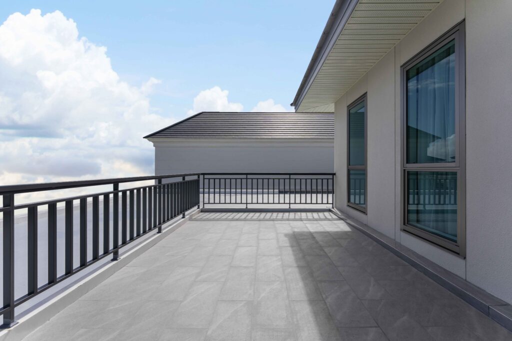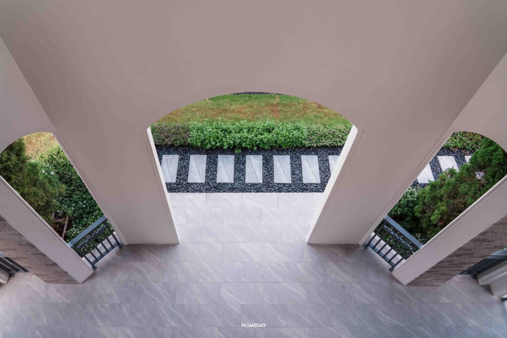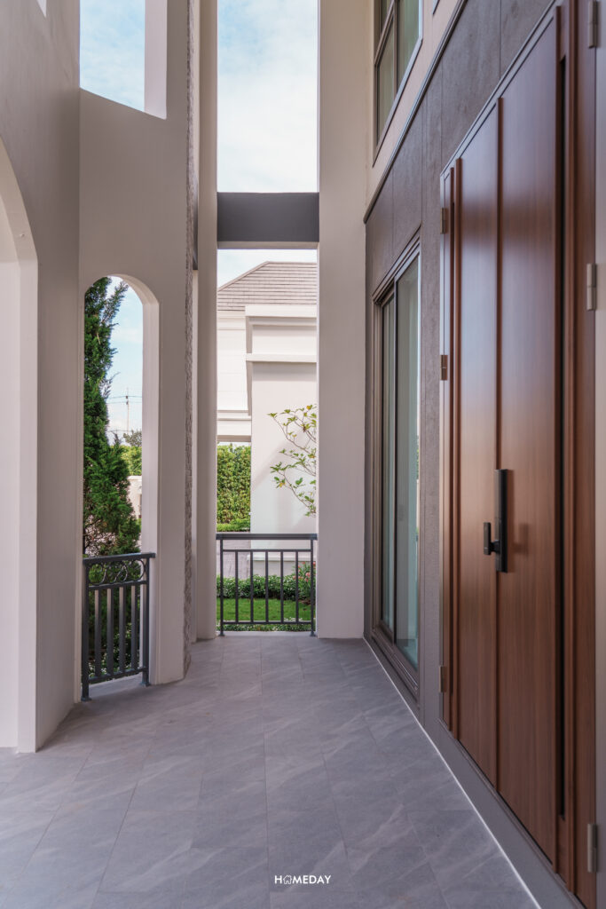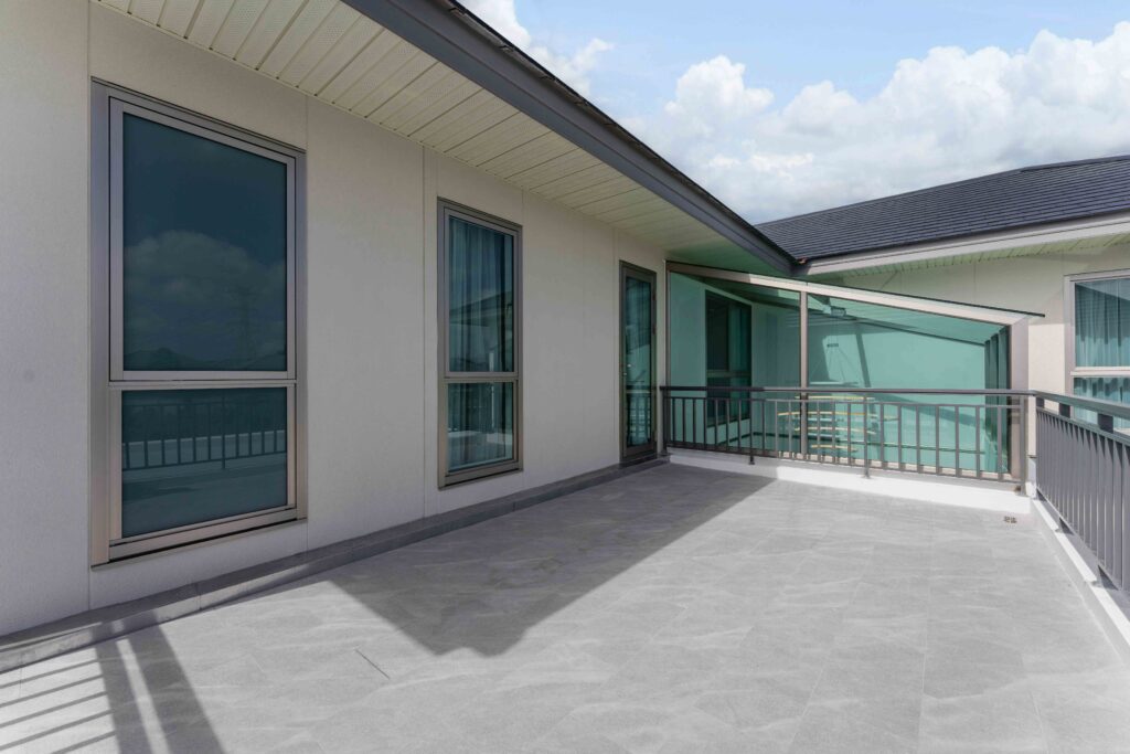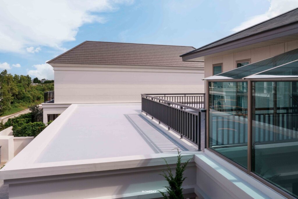 พื้นที่ระเบียง Roof Slab ตรงนี้ถือว่าเป็นอีกมุมที่น่าสนใจมากครับ เพราะมีขนาดกว้างจริง ๆ ใช้งานได้หลากหลาย จะต่อเติมเป็น Gym Room ส่วนตัวไว้ชมวิวก็ได้ หรือถ้าอยากได้มุมชิล ๆ ก็สามารถทำเป็น สวนกระจกแบบ Glass House เชื่อมต่อกับพื้นที่ Double Volume ด้านล่างได้เลย เป็นจุดที่มอบทั้งวิวและแสงธรรมชาติแบบเต็มตา เหมาะกับการใช้เป็นมุมพักผ่อนของบ้าน หรือพื้นที่กิจกรรมที่ทุกคนในครอบครัวมาใช้ร่วมกันครับ