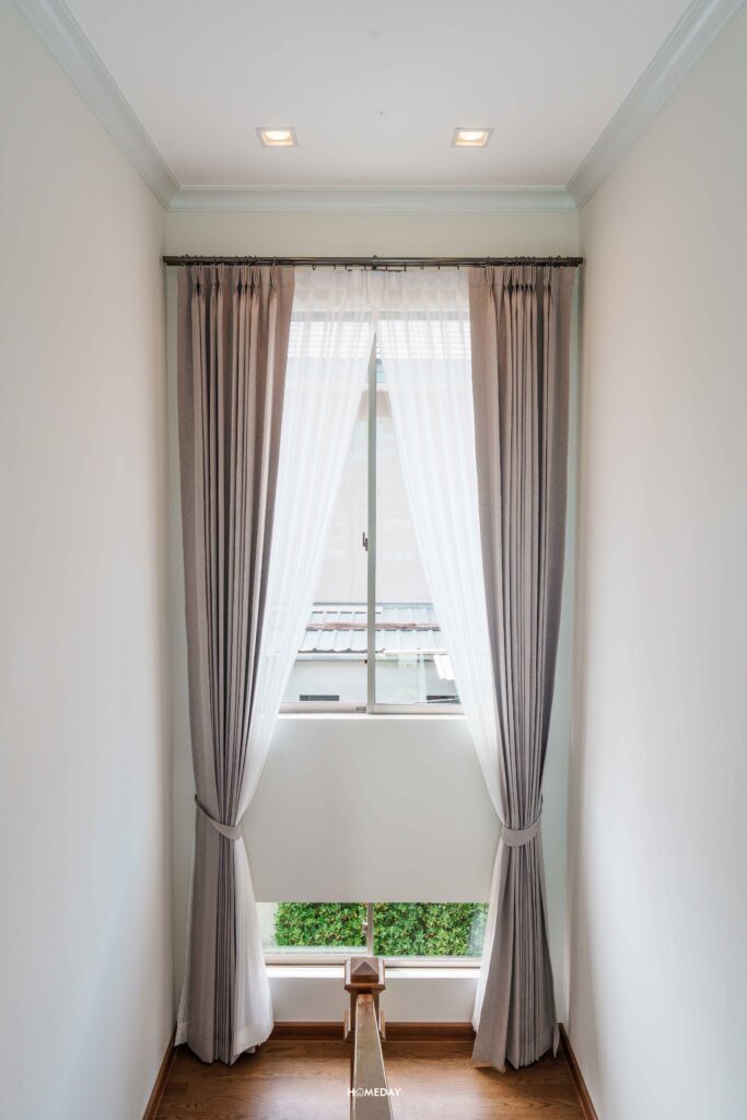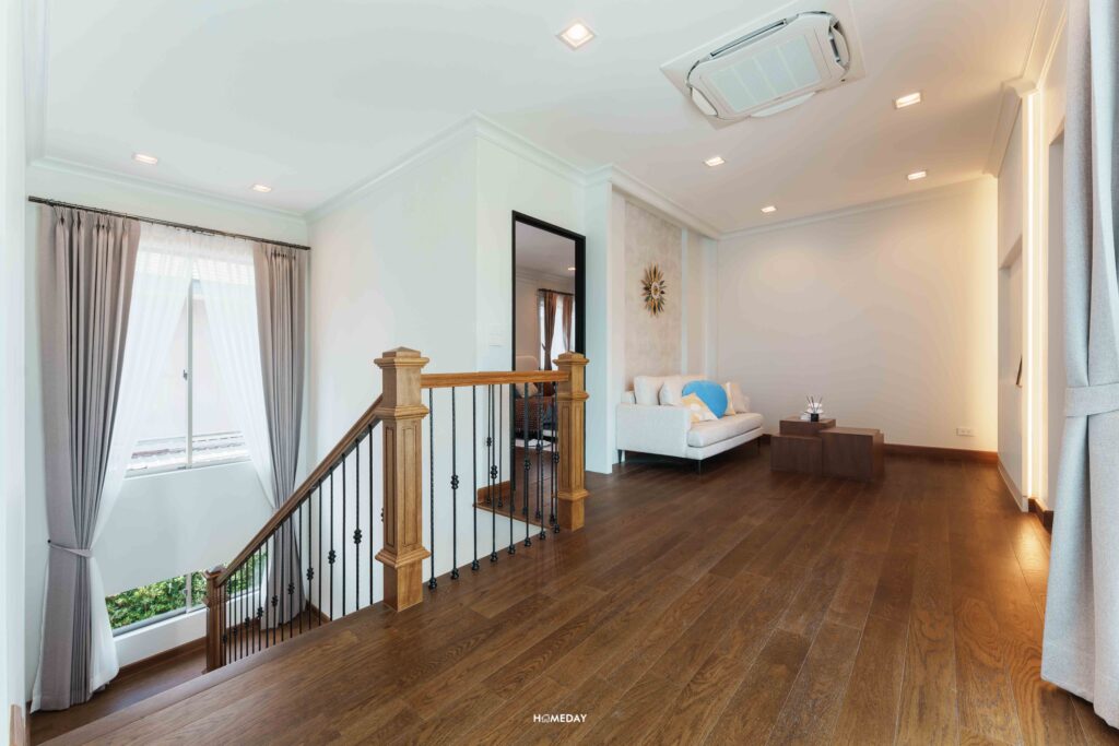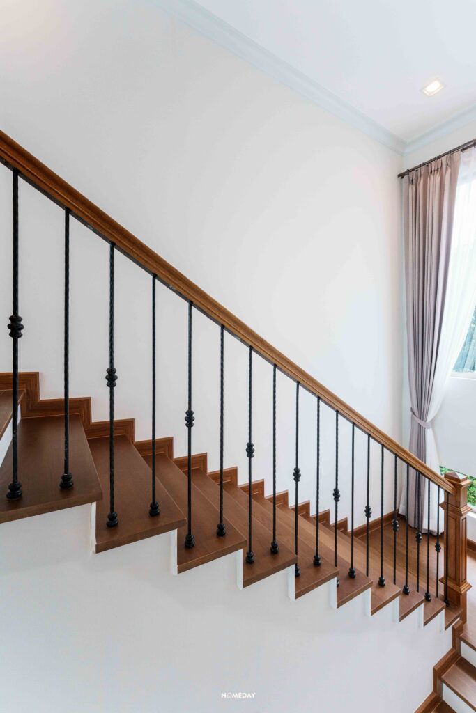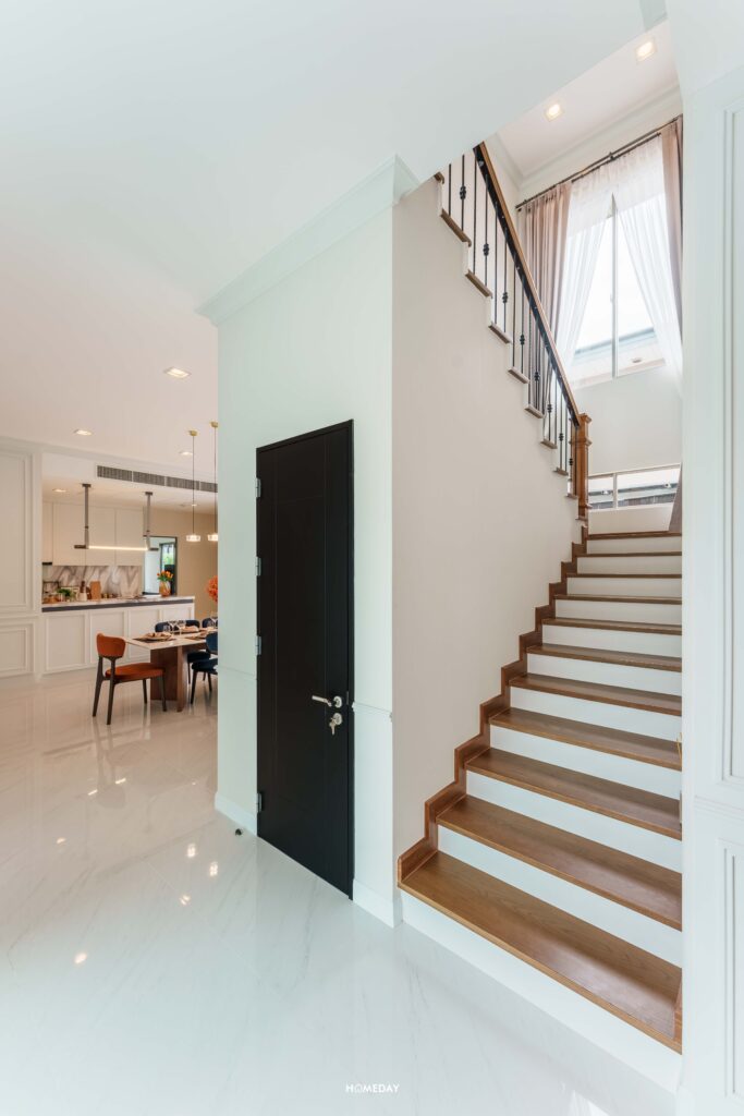 กลับมาที่โถงบันไดทางขึ้นชั้นบนกันครับ บริเวณชานพักบันได จะมีหน้าต่างบานใหญ่ที่ช่วยดึงแสงธรรมชาติเข้ามาได้ดี ทำให้พื้นที่ตรงนี้สว่างตลอดทั้งวันโดยไม่ต้องเปิดไฟ ถือเป็นอีกจุดที่ช่วยประหยัดพลังงานไปในตัว และถ้าใครอยากเพิ่มความหรูหราให้บ้านมากขึ้น สามารถติดตั้งโคมไฟ Chandelier เพิ่มได้เลยครับ แสงจากโคมไฟจะสะท้อนกับช่องแสงธรรมชาติ กลายเป็นจุดเด่นที่ทำให้บันไดดูโปร่งและมีมิติยิ่งขึ้นครับ