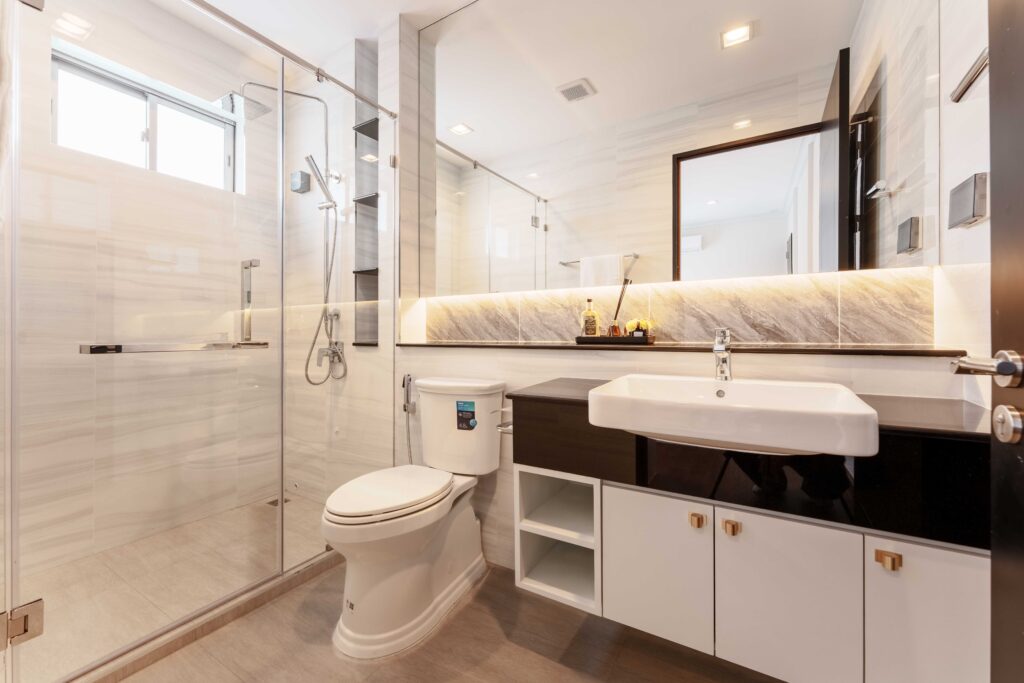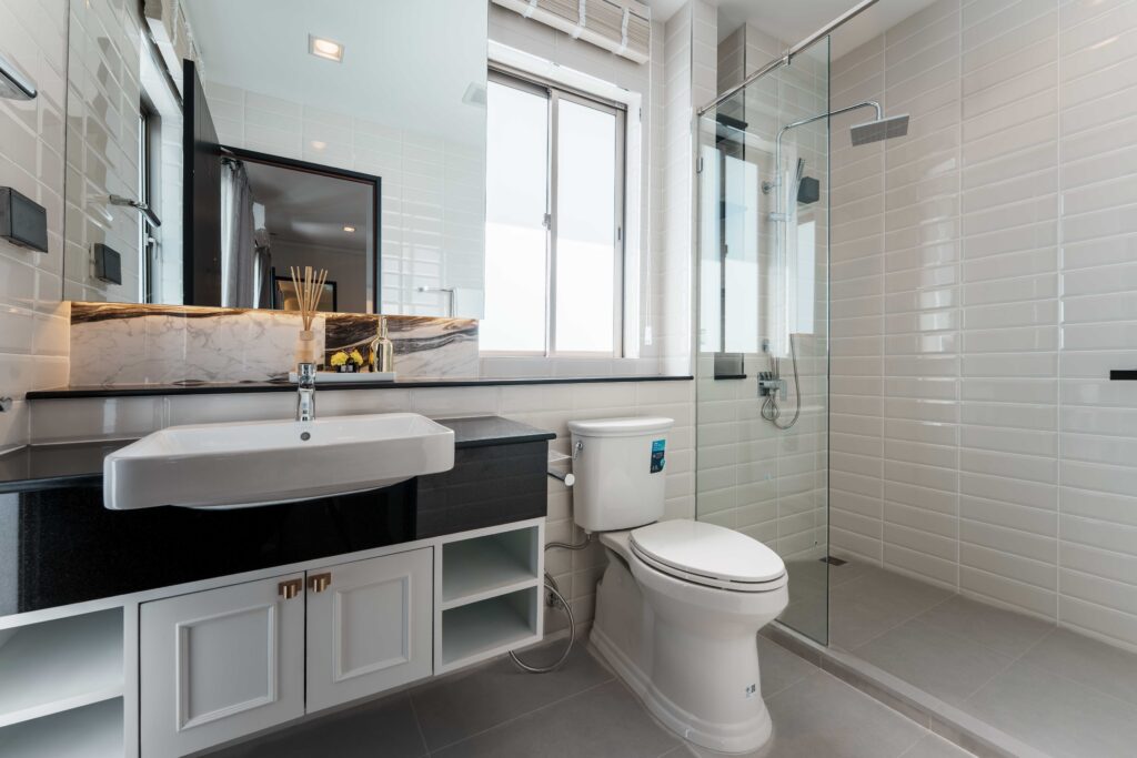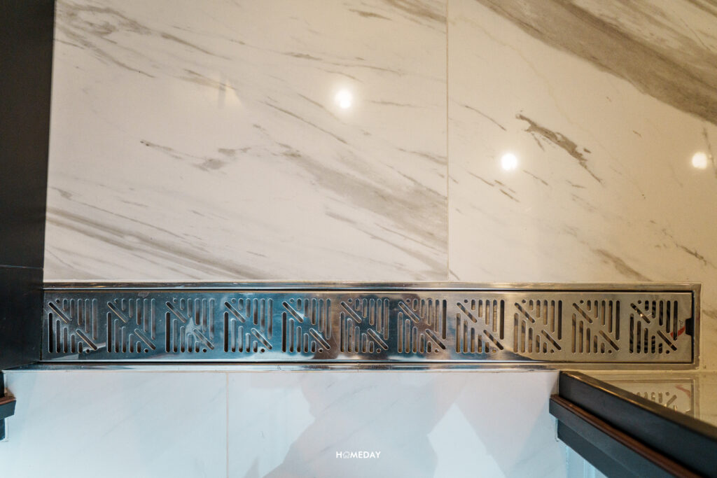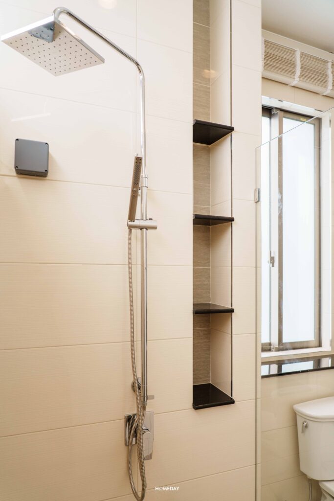 ในส่วนของโซนแห้งจะมี Low Wall วางของตกแต่งเล็ก ๆ อย่างเครื่องหอมหรือแปรงสีฟันได้ด้วย ส่วนโซนเปียกจะมี Drop Wall เป็นชั้นให้ 4 ชั้นครับวางขวดแชมพู ขวดครีมอาบน้ำได้สบายหลายชุดเลย ชุดฝักบัวที่ให้ได้ทั้ง Rain Shower แบบฝักบัวเพดาน สำหรับใครที่ชอบอาบน้ำแบบสปาและ Hand Shower แบบสายยืดได้ สำหรับใช้งานทั่วไปหรือดูแลผู้สูงอายุได้สะดวก ถือว่าออกแบบมาครบทั้งความสวยงามและฟังก์ชันการใช้งานจริง ๆ
