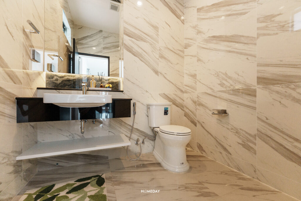 สำหรับห้องน้ำส่วนกลางไว้รับแขก จะเป็นห้องน้ำแบบ Powder Room คือห้องนี้ไม่มีส่วนอาบน้ำ แต่ดีไซน์กว้างและใช้งานสะดวก มาพร้อมพื้นไร้สเต็ป มี Drain Floor ระบายน้ำหน้าห้องน้ำกันลื่นได้ดี ภายในจัดสเปซมาอย่างลงตัว มี อ่างล้างมือ ที่ด้านล่างสามารถวางของได้ จะสต็อกกระดาษชำระหรือวางตะกร้าเล็ก ๆ ก็ยังเหลือพื้นที่ กระจกเงาบานใหญ่ช่วยให้ห้องดูกว้างขึ้น และ Low Wall สำหรับวางของแต่งกลิ่นหอม หรือของตกแต่งเล็ก ๆ ได้อีกจุด ส่วนระบบต่าง ๆ ทั้งปลั๊กเต้าเสียบแบบมีฝาครอบ, พัดลมระบายอากาศ และหน้าต่างบานเลื่อน สำหรับช่วยระบายความชื้น โถสุขภัณฑ์ทั้งหมดใช้แบรนด์ KOHLER ทั้งหลังเลยครับ วัสดุดูดีและทนทาน ส่วนพื้นและผนังห้องน้ำจะได้เป็น กระเบื้องโทนเดียวกับบ้านตัวอย่าง แบบที่เห็นนี้เลยครับ
