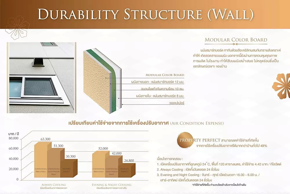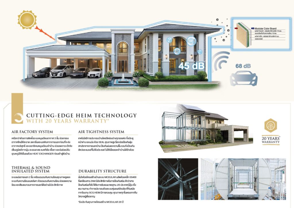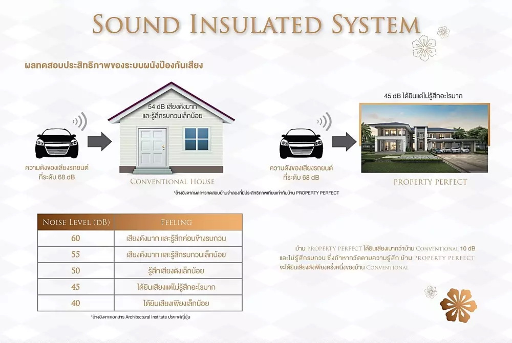 ระบบ Thermal & Sound Insulation ก่อผนังสองชั้น วัสดุเป็นผนังสมาร์ทบอร์ด 2 อัน คั้นกลางด้วยฉนวนใยแก้วกันความร้อน ที่ช่วยให้อุณหภูมิในบ้านเย็น รวมถึงลดเสียงรบกวนจากภายนอกได้มากกว่า 20 เดซิเบล มากกว่าบ้านทั่วไปอีกด้วย แม้อยู่ใกล้สนามบินก็ยังเงียบสงบ
