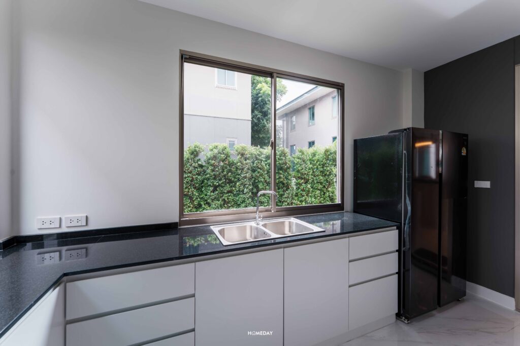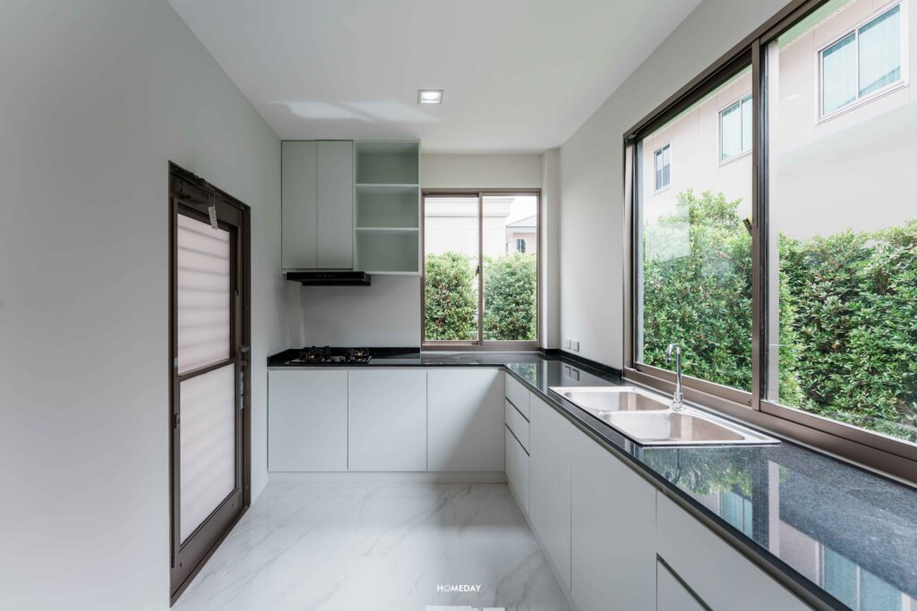 เข้ามาที่ส่วนห้องครัวปิดกันครับ ตรงนี้ทางโครงการได้ Built-in ชุดครัวรูปตัว L มาให้ดูเป็นตัวอย่าง เผื่อเป็นไอเดียสำหรับจัดครัวจริงในอนาคต ซึ่งพื้นที่ตรงนี้ถือว่ากว้างมากเลยครับ ถ้าใครอยากเพิ่มตู้เก็บของหรือตู้แขวนก็สามารถ Built-in เพิ่มเติมได้แบบไม่อึดอัด แถมยังมีพื้นที่เหลือสำหรับวาง ตู้เย็นขนาดใหญ่ ได้สบาย พื้นครัวจะปูด้วยกระเบื้องทั้งห้อง ทำให้เช็ดทำความสะอาดง่าย ไม่กลัวคราบน้ำหรือคราบอาหาร ผิวสัมผัสของกระเบื้องก็จะได้ตามแบบที่เห็นในบ้านตัวอย่างเลยครับ มีหน้าต่างบานเลื่อนขนาดใหญ่ ช่วยระบายอากาศและรับแสงธรรมชาติได้ดี ส่วนด้านหลังสุดของครัวจะมีประตูออกไปยังโซนซักล้างและห้องแม่บ้าน ซึ่งมีห้องน้ำแยกส่วนตัว ไม่รวมกับพื้นที่เจ้าของบ้าน ทำให้การใช้งานแต่ละส่วนชัดเจนและเป็นสัดส่วนมากครับ