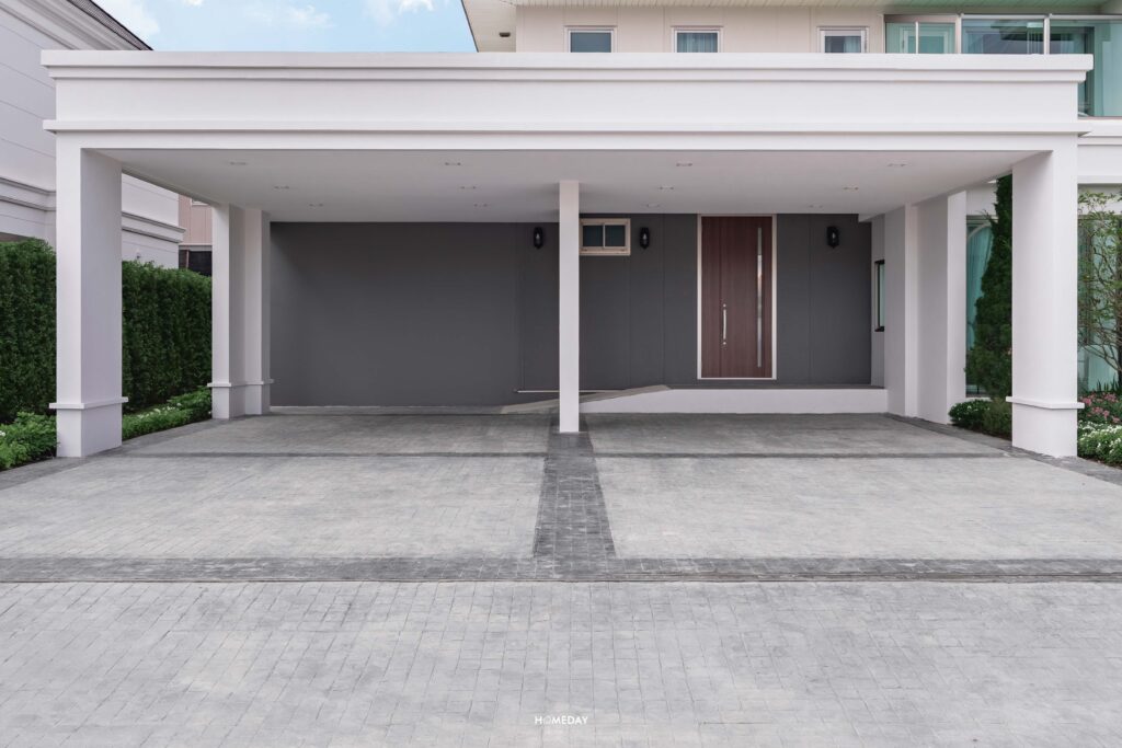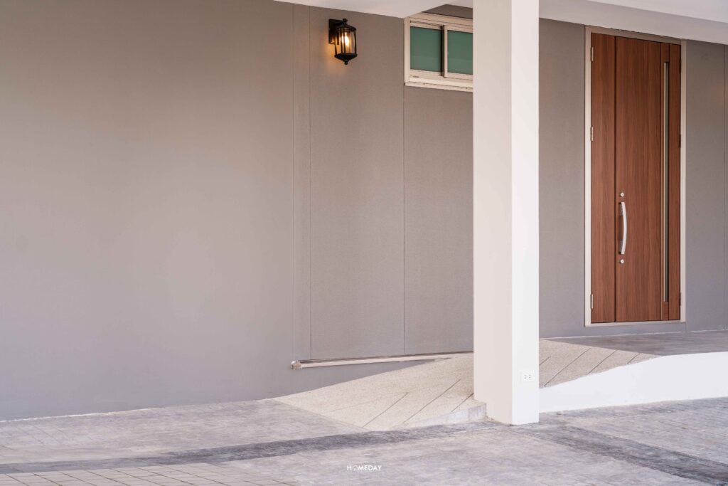 บริเวณพื้นที่จอดรถ จอดได้ถึง 4 คัน แบ่งเป็นช่องละ 2 คัน ตัวพื้นเป็น Stamped Concrete ดูสวย เนี้ยบ และที่สำคัญคือแข็งแรงมาก รับน้ำหนักรถได้ดี เหมาะกับการใช้งานภายนอกสุด ๆ เวลาแดดส่องหรือฝนตกก็ยังดูสะอาดตา อีกอย่างที่ผมชอบคือ บ้านนี้ออกแบบด้วยแนวคิด Universal Design คือคิดเผื่อทุกวัยในครอบครัวจริง ๆ โดยเฉพาะ ทางลาดเชื่อมจากโรงจอดรถเข้าสู่ภายในบ้าน สะดวกขึ้นเดินเข้าบ้านได้สะดวก ไม่ต้องมีขั้นบันได เหมาะกับทั้งผู้สูงอายุ ผู้ใช้วีลแชร์ หรือแม้แต่ตอนหิ้วของจากรถ เข้าบ้านก็ง่ายมาก แต่อาจจะต้องยกขึ้นมาหนึ่งสเต็ปนะครับ ไม่ได้มีทางลาดเข้าประตูได้เลย แต่ก็ยังเชื่อมต่อโซนเซอร์วิสได้ง่าย เป็นระเบียบไม่รบกวนโซนรับแขก หรือพักผ่อนหน้าบ้านอีกด้วยครับ