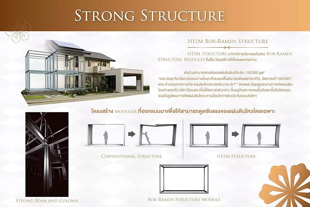 จุดเด่นโครงการ • โครงสร้างแข็งแรง มาตรฐานญี่ปุ่น โครงสร้างระบบ Heim BOX-RAMEN มาตรฐานญี่ปุ่น รองรับแรงสั่นสะเทือนได้ถึงระดับ 7 ประกอบจากเหล็กเคลือบสารกันสนิมคุณภาพสูง รับประกันโครงสร้างนาน 20 ปี* พร้อมระบบ Floor Service ซ่อมบำรุงง่าย ไม่ต้องขุดเจาะ