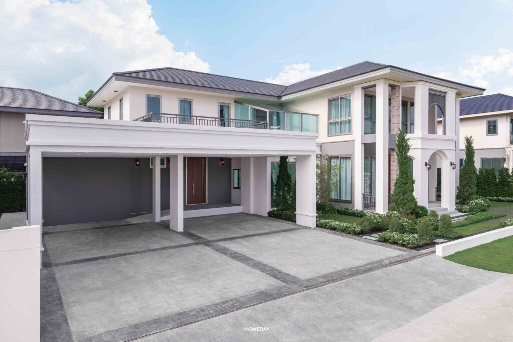 วันนี้ผมจะพามารีวิวแบบบ้าน NEW PALACIO กันครับ บ้านหลังนี้เป็นแบบบ้านใหม่ล่าสุดของโครงการเลยครับ พื้นที่ใช้สอย 470 ตร.ม. ฟังก์ชัน 5 ห้องนอน 6 ห้องน้ำ 1 พื้นที่อเนกประสงค์ 1 ห้องแม่บ้านและที่จอดรถ 4 คัน ออกแบบมาในสไตล์ Modern Luxury ที่เน้นทั้งความทันสมัยและความหรูหราอย่างลงตัว โทนสีหลักของบ้านจะใช้ ขาว-เทา ให้ฟีลเรียบ สะอาดตา แต่ยังดูภูมิฐานและอบอุ่นในเวลาเดียวกัน ตัวบ้านเป็นบ้านเดี่ยว 2 ชั้น หน้ากว้างขนาดใหญ่ มีการออกแบบให้พื้นที่ระหว่างชั้นล่างและชั้นบนเชื่อมต่อกันด้วยช่องแสงและ Double Volume ที่ช่วยให้บ้านดู สูง โปร่ง และโล่งสบาย มากกว่าบ้านทั่วไป และจุดเด่นที่อยากชูมากคือ Floor to Ceiling สูงถึง 3.2 เมตร ซึ่งสูงกว่าบ้าน Heim โดยทั่วไปซึ่งจะอยู่ที่ราว ๆ 2.8 เมตร ถือว่าเป็นโครงสร้าง Modular รุ่นใหม่ของ SCG Heim ที่ยังไม่ค่อยมีในตลาดมากนัก ทำให้ได้มิติบ้านที่สูงและโปร่งกว่า พร้อมความรู้สึกพรีเมียมตั้งแต่ก้าวแรกครับ