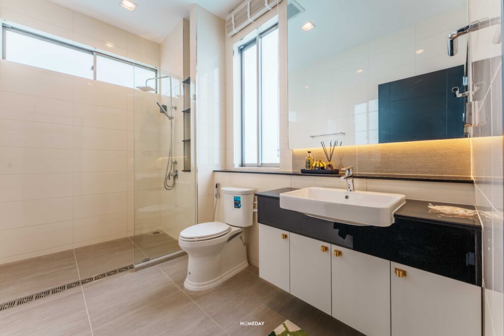 ห้องน้ำในห้องนอนชั้นล่างนี้ถือว่าออกแบบมาได้พิเศษกว่าห้องอื่น ๆ เลยครับ เพราะคิดเผื่อการใช้งานของทุกวัยจริง ๆ เริ่มจากประตูทางเข้าที่กว้างเป็นพิเศษ เพื่อให้สามารถเข็นรถวีลแชร์เข้า-ออกได้สะดวก พื้นห้องน้ำเป็นแบบไร้ธรณีประตู ป้องกันการสะดุดและลื่นล้ม แถมยังมี Drain Floor 2 จุด เพื่อระบายน้ำได้ ไม่กระเด็นออกมาด้านนอก ภายในแยกโซนเปียก-โซนแห้งชัดเจน ได้หน้าต่างบานเลื่อนขนาดใหญ่ 2 จุด ช่วยให้แสงและลมธรรมชาติเข้ามาได้ดี ลดความอับชื้น วัสดุปูพื้นและผนังจะได้ตามแบบที่เห็นในบ้านตัวอย่างเลยครับ ส่วนอุปกรณ์ภายในจัดให้ครบทั้ง เต้าเสียบปลั๊กแบบมีฝาครอบ, พัดลมระบายอากาศ, อ่างล้างหน้าแบบมีตู้เก็บของด้านล่าง, กระจกเงาเต็มผนัง, โถสุขภัณฑ์ และ ชุดฝักบัวอาบน้ำ จากแบรนด์ KOHLER ทั้งชุด ดูดี ใช้งานง่าย และคงทนตามมาตรฐานพรีเมียมของโครงการครับ