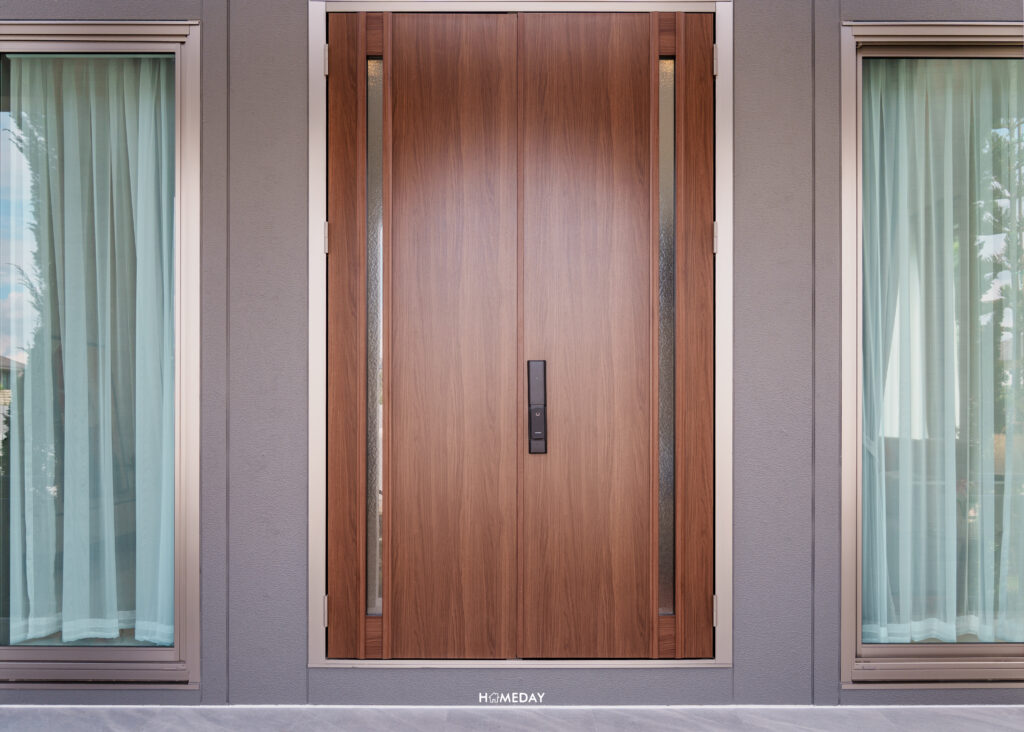 ส่วนประตูและหน้าต่างใช้แบรนด์ Tostem จากญี่ปุ่นทั้งหมด ซึ่งขึ้นชื่อเรื่องความแข็งแรงและงานประกอบที่แน่นหนา ประตูหลักของบ้านสามารถ เปิดได้สองฝั่ง ช่วยให้ขนของชิ้นใหญ่เข้าบ้านได้ง่าย ไม่ต้องกลัวติดขอบประตู และยังติดตั้งระบบ Digital Door Lock มาให้เรียบร้อย สะดวกและปลอดภัย ส่วนประตูโรงจอดรถจะยังไม่ได้ติดตั้งมาให้นะครับ เผื่อให้เจ้าของบ้านเลือกดีไซน์หรือระบบที่ชอบได้เอง