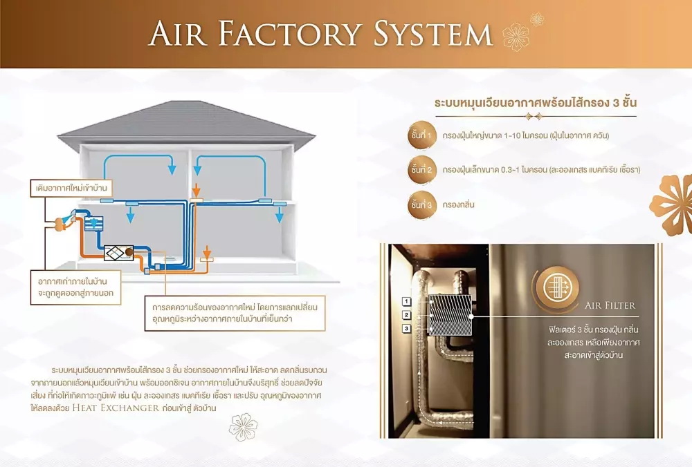 ส่วนระบบภายในบ้านก็ถือว่าครบเครื่องสุด ๆ เหมือนหัวใจสำคัญหลักของบ้าน คือระบบหมุนเวียนอากาศ หรือ Air Factory System ที่กรองอากาศ 3 ชั้น ลดฝุ่น PM 2.5 เชื้อรา และแบคทีเรีย ให้อากาศภายในบ้านสะอาดระดับห้องปลอดเชื้อ พร้อมปรับอุณหภูมิและความชื้นให้อยู่ในระดับ 40-60% ตลอดเวลา