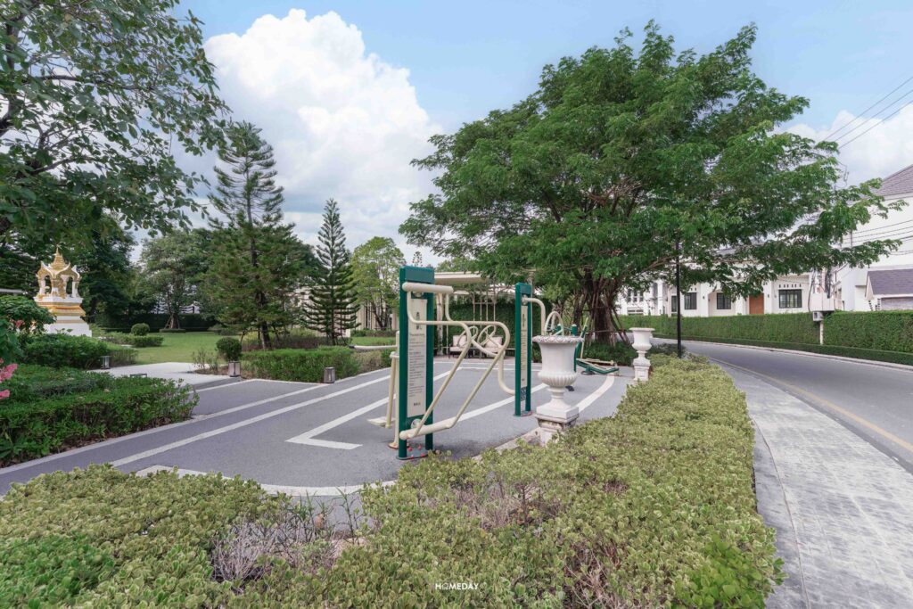 ในโซนสวนยังมีเครื่องออกกำลังกายกลางแจ้ง จัดวางไว้ให้ลูกบ้านได้ใช้งานกันด้วยครับ เหมาะสำหรับคนที่ชอบออกกำลังกายเบา ๆ ไม่ว่าจะยืดเส้นยืดสายตอนเช้า หรือออกมาฟื้นฟูร่างกายหลังเลิกงาน รอบ ๆ พื้นที่สวนยังมี Jogging Track ล้อมรอบ ให้ลูกบ้านได้วิ่งหรือเดินออกกำลังกายได้ บรรยากาศโดยรวมเงียบสงบ เหมาะมากสำหรับการพักผ่อนและใช้เวลาใกล้ชิดธรรมชาติครับ