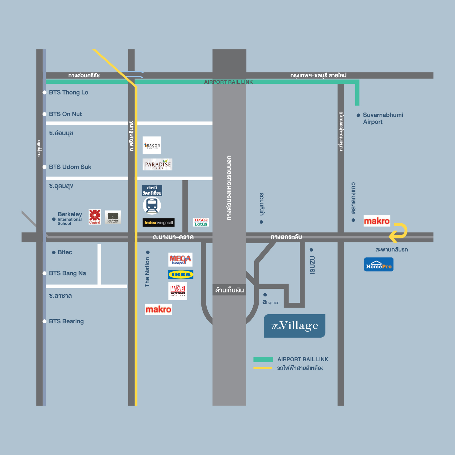 การเดินทาง ทางพิเศษศรีรัชแอร์พอร์ตลิงค์ สถานีมักกะสันรถไฟฟ้า MRT สถานีห้วยขวาง สถานศึกษารร.เตรียมอุดมฯ รัชดา ม.หอการค้าไทย รร.บางกอกทวิวิทย์ รร.นานาชาติ KIS รร.นานาชาติ The Regent’s รร.สมาคมไทย-ญี่ปุ่น