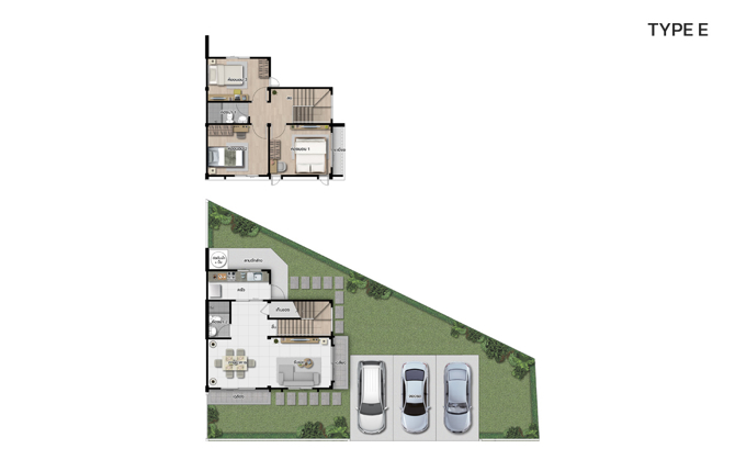 ชั้น 1 ที่จอดรถ 3 คัน, เฉลียงหน้าบ้าน, พื้นที่รับแขก, พื้นที่รับประทานอาหาร, ห้องนํ้า,ห้องครัว (เตรียมท่อนํ้าดี /นํ้าทิ้งให้), เฉลียงด้านข้าง, ลานซักล้าง, ห้องเก็บของชั้น 2 ห้องนอนใหญ่ พร้อมระเบียง, ห้องนอน 2, ห้องนอน 3, ห้องนํ้า, โถงบันได
