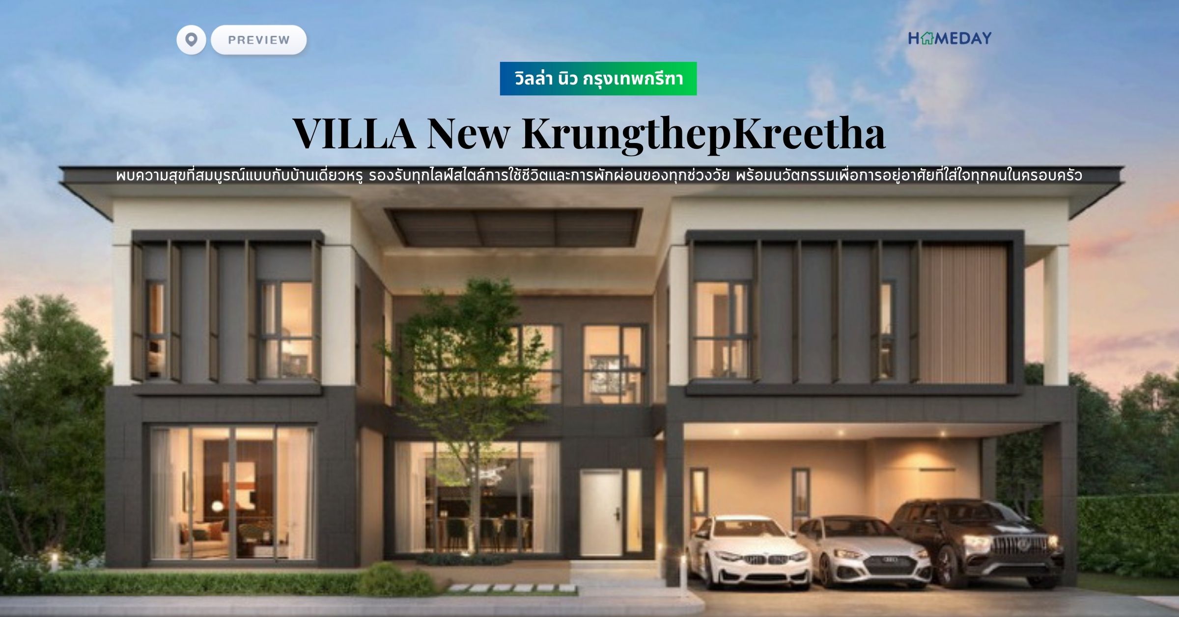 "โครงการ วิลล่า นิว กรุงเทพกรีฑา (VILLA New KrungthepKreetha) พบความสุขที่สมบูรณ์แบบกับบ้านเดี่ยวหรู บนทำเลศักยภาพ โดดเด่นด้วยบ้านสไตล์ Modern Tropical พร้อมส่วนกลางขนาดใหญ่ ที่รองรับทุกไลฟ์สไตล์การใช้ชีวิตและการพักผ่อนของทุกช่วงวัย พร้อมนวัตกรรมเพื่อการอยู่อาศัยที่ใส่ใจสิ่งแวดล้อมและทุกคนในครอบครัว"