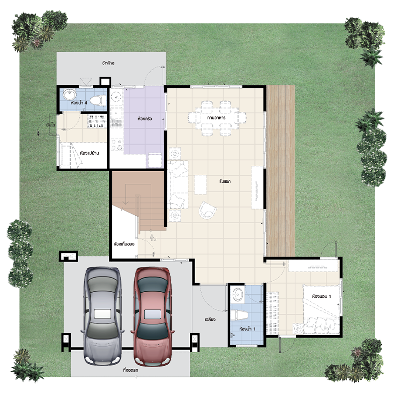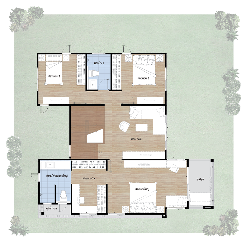 แบบบ้าน : เซอร์แมท พื้นที่ใช้สอย 549 ตร.ม. 6 ห้องนอน 6 ห้องน้ำ 1 ห้องรับแขก 1 ห้องรับประทานอาหาร 1 ห้องครัว 1 ห้องตากผ้าในร่ม 1 ห้องพระ 1 Sunken Lounge 1 ห้องซัก-รีด 1 ห