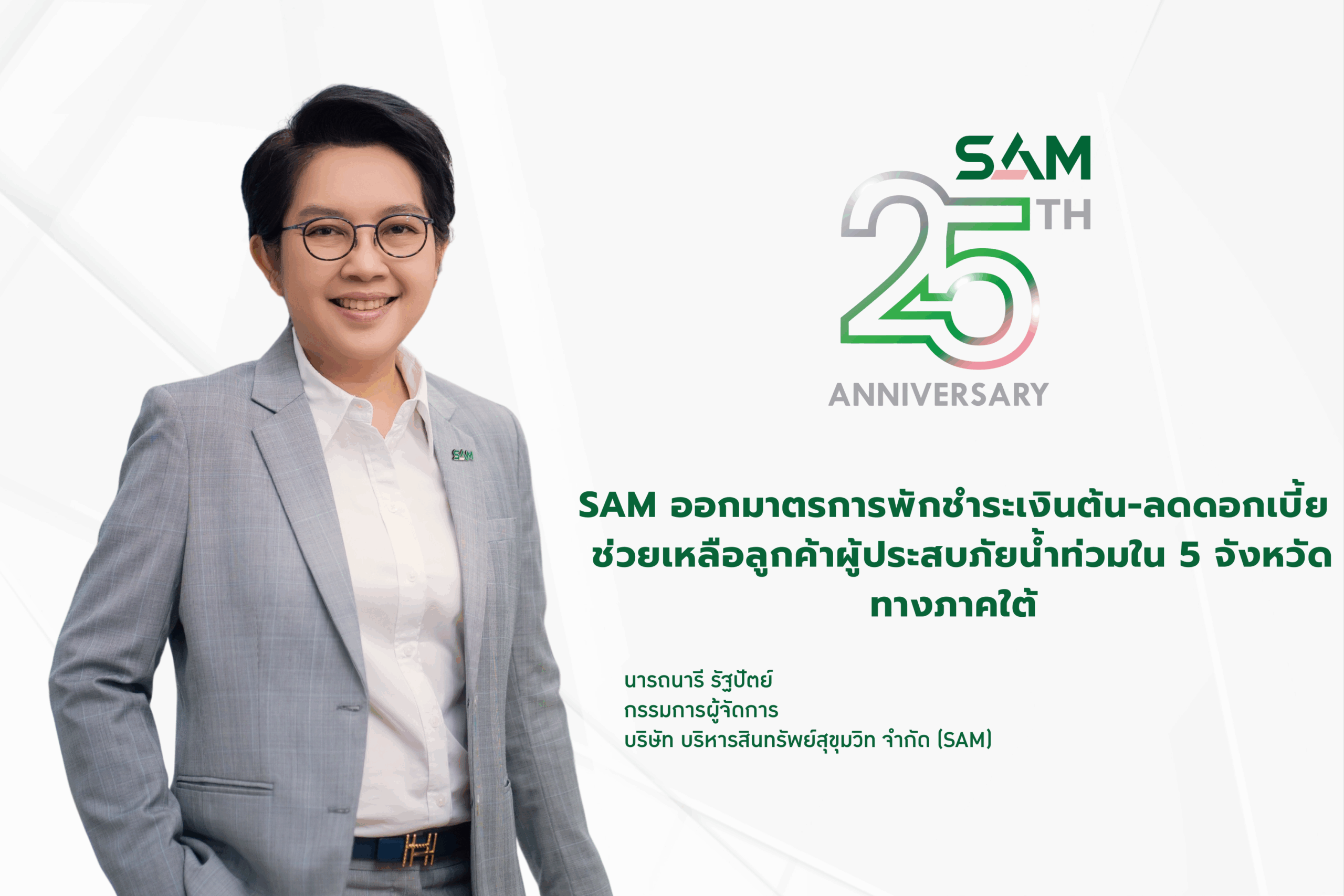“SAM มีความห่วงใยต่อประชาชนและลูกค้าปรับโครงสร้างหนี้ NPL ทุกราย โดยเฉพาะผู้ที่กำลังเผชิญผลกระทบจากเหตุอุทกภัยในพื้นที่ 5 จังหวัดภาคใต้ มาตรการเร่งด่วนนี้พร้อมช่วยเหลือลูกค้าที่ได้รับผลกระทบ เพื่อให้กลับมาฟื้นตัวใช้ชีวิตและดำเนินธุรกิจได้ตามปกติอีกครั้ง สะท้อนถึงความตั้งใจของ SAM ในการยืนหยัดเคียงข้างและให้ความช่วยเหลือประชาชนอย่างรวดเร็ว เท่าเทียม และเป็นธรรมตามนโยบายบริษัทบริหารสินทรัพย์เพื่อสังคม หรือ Social AMC อีกทั้งสอดคล้องกับวิสัยทัศน์ของ SAM บริษัทบริหารสินทรัพย์แห่งรัฐ