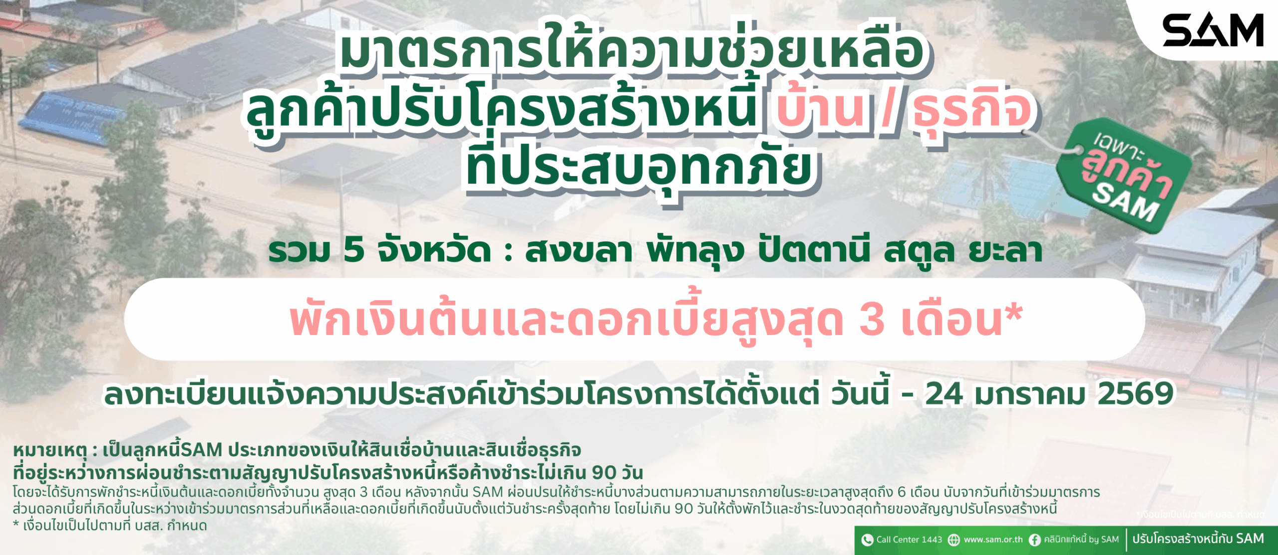 ส่วนดอกเบี้ยที่เกิดขึ้นในระหว่างเข้าร่วมมาตรการส่วนที่เหลือ และดอกเบี้ยที่เกิดขึ้นนับตั้งแต่วันชำระครั้งสุดท้ายโดยไม่เกิน 90 วัน ให้ตั้งพักไว้และชำระในงวดสุดท้ายของสัญญาปรับโครงสร้างหนี้ เงื่อนไขเป็นไปตามที่ SAM กำหนด ลูกค้าสามารถแจ้งความประสงค์เข้าร่วมโครงการได้ตั้งแต่บัดนี้ – 24 มกราคม 2569 เพื่อให้ SAM เร่งดำเนินการบรรเทาความเดือดร้อนได้อย่างรวดเร็ว