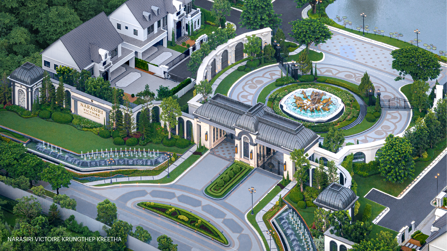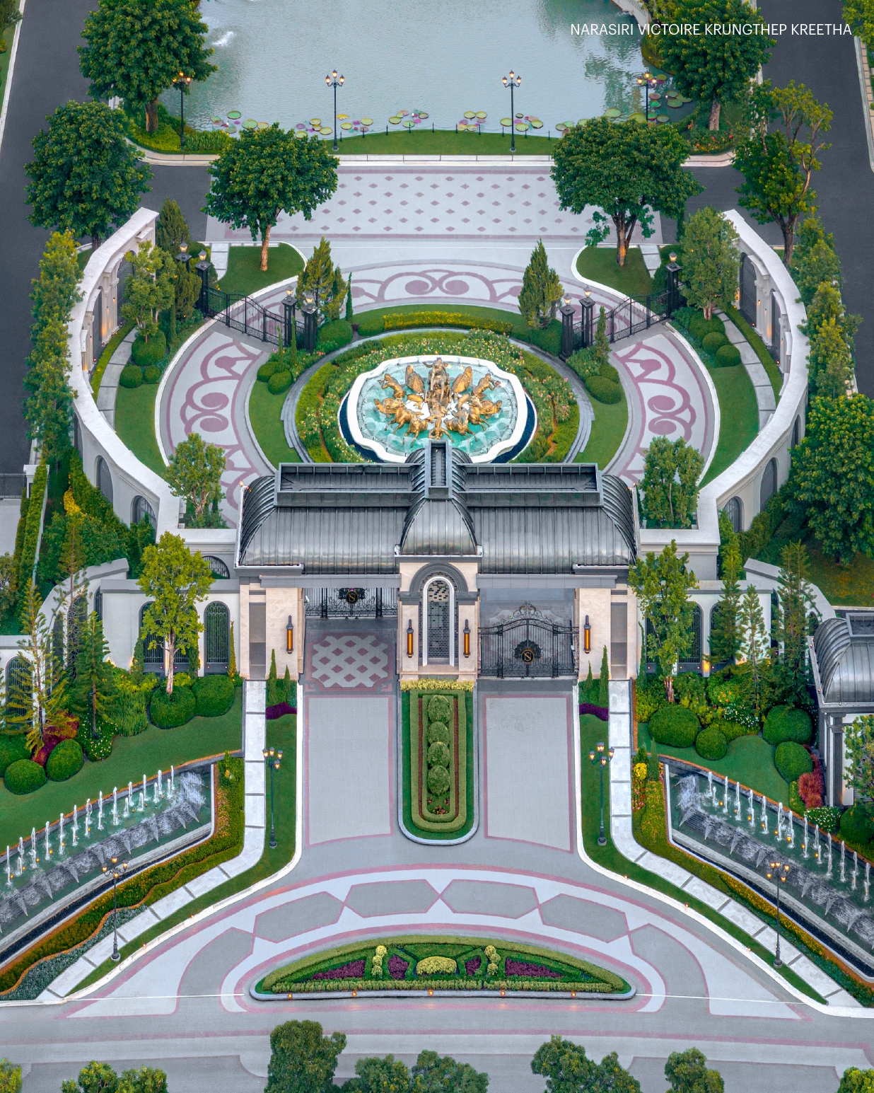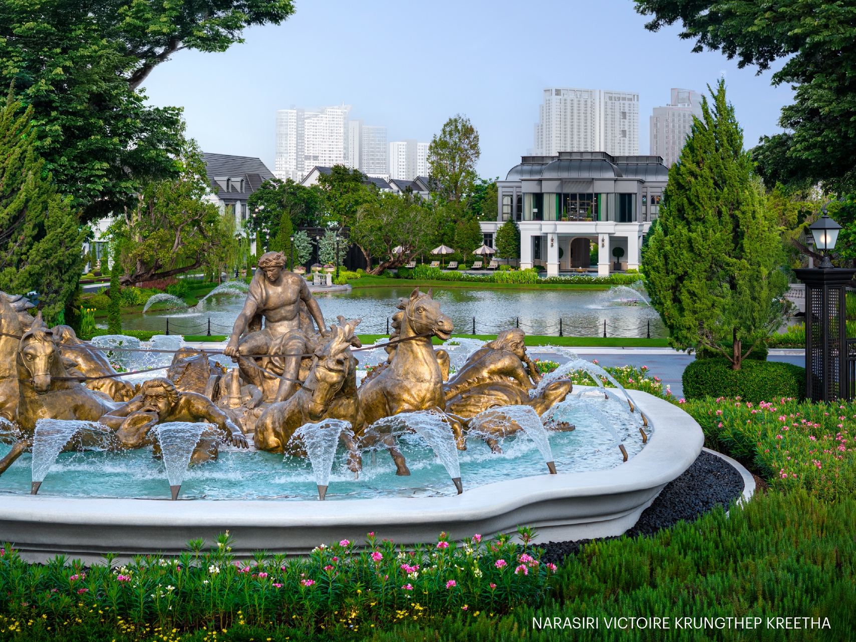 และไฮไลท์งานสถาปัตยกรรม ‘Apollo Fountain’ น้ำพุเทพสุริยะ ที่ถอดแบบรูปปั้นเทพอะพอลโลกำลังขับรถม้าขึ้นจากท้องทะเลสู่สุริยะแบบเดียวกับพระราชวังแวร์ซาย (Le Château de Versailles) สัญญะแห่งเทพ ที่จะเสริมความรุ่งโรจน์แก่ผู้อยู่อาศัย