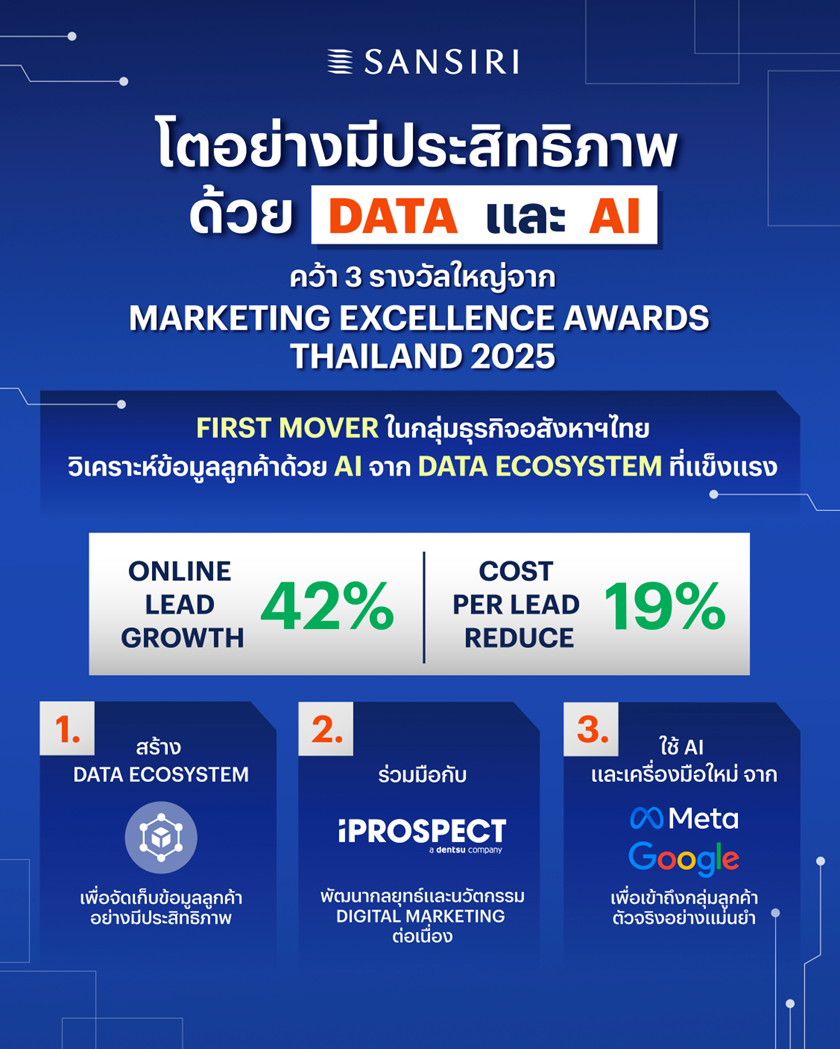 แสนสิริ ผู้นำอสังหาริมทรัพย์ไทย ตอกย้ำความเป็น “Trendsetter” ในตลาด ด้วยการประกาศความสำเร็จครั้งสำคัญ ในการใช้ Data และ AI เข้ามาขับเคลื่อนการตลาดอย่างบูรณาการ จนสามารถ คว้า 3 รางวัล จากเวที Marketing Excellence Awards Thailand 2025 ความสำเร็จนี้ไม่ใช่แค่การก้าวทันเทคโนโลยี แต่คือบทพิสูจน์ว่า แม้ในภาวะที่ตลาดอสังหาฯ ผันผวน “ความแม่นยำ” ในการระบุผู้ซื้อคุณภาพด้วย AI คือคำตอบที่ทำให้ ROI (ผลตอบแทนจากการลงทุน) เพิ่มขึ้นอย่างมีนัยสำคัญ พร้อมเบื้องหลังความสำเร็จคือการผนึกกำลังกับพันธมิตรเอเจนซี่อย่าง iProspect และแพลตฟอร์มระดับโลก ที่ร่วมกันวางระบบจัดเก็บและใช้ข้อมูลการตลาดอย่างเป็นระบบ ผ่านการทำงานของ AI ที่สามารถวิเคราะห์เชิงลึกบุคลิกลักษณะของลูกค้าที่มีแนวโน้มการซื้อได้อย่างแม่นยำ