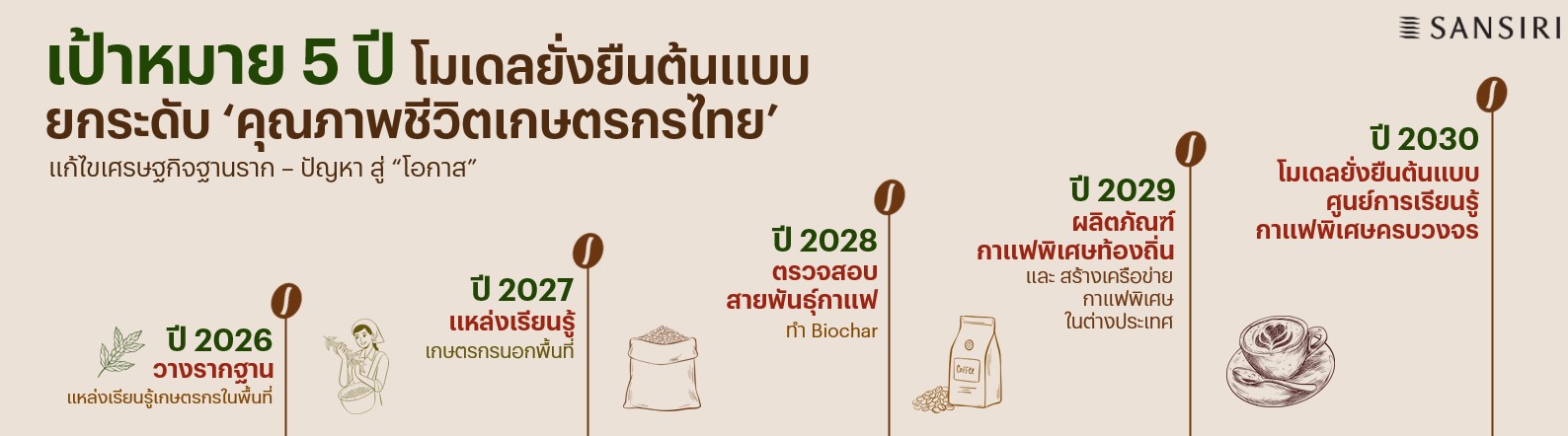 “ต่อมาแสนสิริได้มีโอกาสปรึกษากับตลาดหลักทรัพย์แห่งประเทศไทย และได้รับคำแนะนำถึงแนวทางการส่งเสริมให้บริษัทจดทะเบียนต่อยอดการสร้าง Social Enterprise เพื่อสร้างผลลัพธ์ทางสังคมได้อย่างเป็นรูปธรรม อาทิ จัดตั้งหน่วยงาน “วิสาหกิจเพื่อสังคมแบบไม่แสวงหากำไร” ทำหน้าที่ขับเคลื่อนกิจกรรมหรือโปรเจกต์เพื่อสังคมให้มีความต่อเนื่อง สร้างรายได้ด้วยตนเองจากการดำเนินธุรกิจเพื่อไม่ให้ต้องพึ่งพาเงินบริจาคแต่เพียงอย่างเดียว และนำกำไรที่ได้จะกลับคืนสู่ชุมชนทั้งหมด จึงเป็นที่มาของการจัดตั้ง “ศูนย์การเรียนรู้กาแฟพิเศษครบวงจร” เป็นแนวทางที่เราจะใช้พืชเศรษฐกิจอย่างกาแฟมาเป็นตัวเชื่อมโยงให้เกษตรกร และทุกภาคส่วนที่อยู่ในอุตสาหกรรมนี้หันมายกระดับเศรษฐกิจฐานรากร่วมกัน โดยหวังว่าจะเป็นอีกตัวอย่างการสร้างกลไกเพื่อช่วยสร้าง