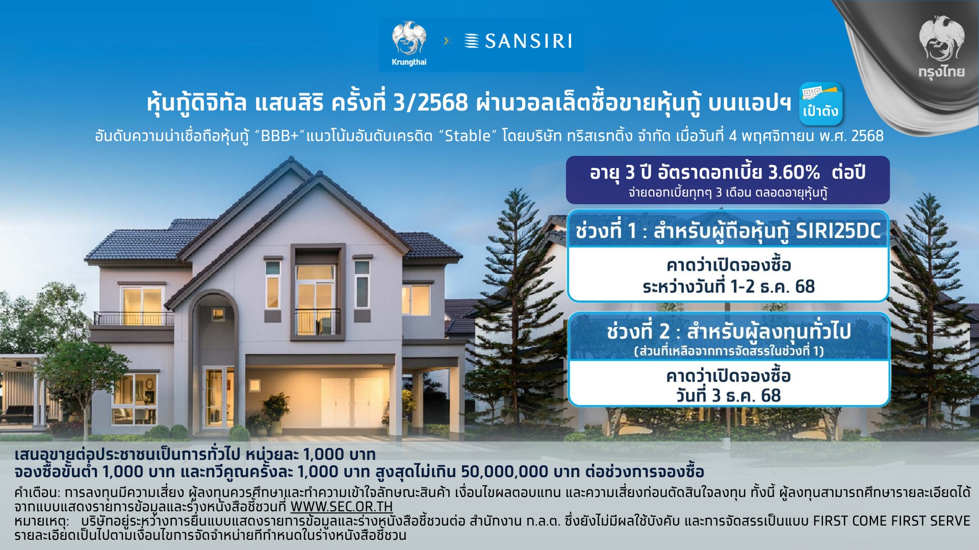 นายวิชาญ วิริยะภูษิต ประธานผู้บริหารสายการเงิน บริษัท แสนสิริ จำกัด (มหาชน) ผู้นำธุรกิจอสังหาริมทรัพย์ไทย เปิดเผยว่า ที่ผ่านมาแสนสิริและธนาคารกรุงไทยประสบความสำเร็จในการเป็นผู้นำที่ริเริ่มการระดมทุนรูปแบบใหม่ที่ทำให้นักลงทุนเข้าถึงการลงทุนง่าย รายแรกของธุรกิจอสังหาริมทรัพย์ในเอเชีย ในปีนี้แสนสิริร่วมมือกับธนาคารกรุงไทยเตรียมเสนอขาย “หุ้นกู้ดิจิทัลแสนสิริ” อีกครั้ง ผ่านการซื้อขายหุ้นกู้บนแอปพลิเคชัน “เป๋าตัง” พร้อมให้สิทธิกับผู้ถือหุ้นกู้ดิจิทัล SIRI25DC ในการจองซื้อหุ้นกู้ดิจิทัลแสนสิริ ชุดใหม่ จองซื้อก่อน เพื่อต่อยอดการลงทุนกับบริษัทที่มั่นคงต่อเนื่อง โดยคาดว่าจะเปิดให้จองซื้อ ในวันที่ 1 ธันวาคม 2568 ซึ่งจะเป็นอีกหนึ่งทางเลือกการลงทุนที่สร้างผลตอบแทนสม่ำเสมอด้วยอัตราดอกเบี้ยคงที่ 3.60% ต่อปี ระยะเวลาลงทุนเพียง 3 ปี รับดอกเบี้ยทุก 3 เดือน รวมทั้งยังสามารถซื้อขายในตลาดรองได้แบบเรียลไทม์ 24 ชั่วโมง โดยหุ้นกู้ดิจิทัลแสนสิริ เป็นหุ้นกู้ชนิดระบุชื่อผู้ถือ ประเภทไม่ด้อยสิทธิ ไม่มีประกัน และมีผู้แทนผู้ถือหุ้นกู้ ได้รับการจัดอันดับความน่าเชื่อถือที่ระดับ BBB+ แนวโน้ม “คงที่” จากบริษัท ทริสเรทติ้ง จำกัด เมื่อวันที่ 4 พฤศจิกายน 2568 สะท้อนถึงแบรนด์ที่แข็งแกร่ง การมีโปรดักส์ที่ตอบรับทุกความต้องการที่อยู่อาศัย ตลอดจนความสามารถในการทำกำไรที่ดี
