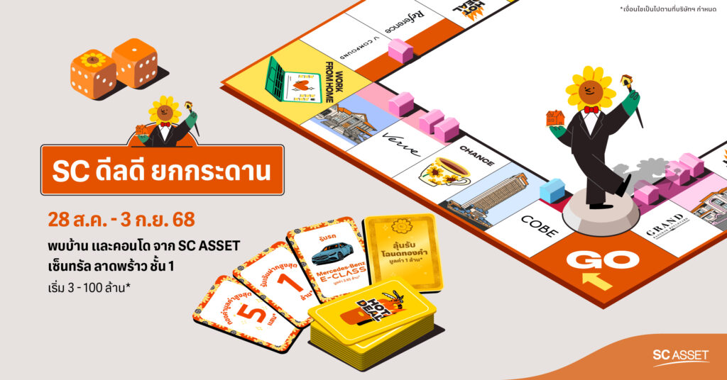 บริษัท เอสซี แอสเสท คอร์ปอเรชั่น จำกัด (มหาชน) ผู้นำด้านอสังหาริมทรัพย์คุณภาพสูงและมีนวัตกรรม ชวนสัมผัสข้อเสนอสุดพิเศษในงาน “SC ดีลดี ยกกระดาน” ยกทัพกว่า 75 โครงการคุณภาพ ทั้งบ้านเดี่ยว ทาวน์โฮม และคอนโดมิเนียม ครอบคลุมทุกทำเลศักยภาพ ในราคาเริ่ม 3 – 100 ล้านบาท เติมเต็มทุกประสบการณ์ด้วยข้อเสนอสุดคุ้มและกิจกรรมสุดพิเศษ ระหว่างวันที่ 28 สิงหาคม – 3 กันยายน 2568 เวลา 10.00 – 21.00 น. ณ เซ็นทรัลลาดพร้าว ชั้น 1 Zone B
