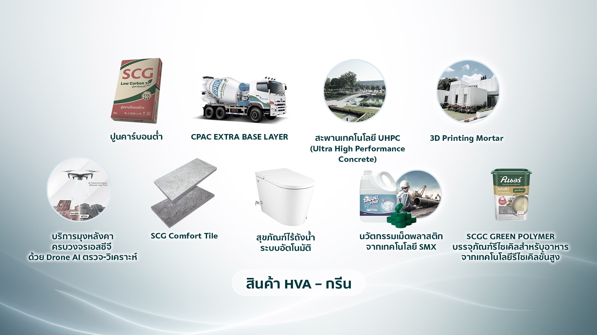 ปูนคาร์บอนต่ำ ปูนคาร์บอนต่ำ อยู่ระหว่างพัฒนาปูนคาร์บอนต่ำรุ่นใหม่ Generation 3 ที่ลดคาร์บอนไดออกไซด์ได้ถึง 38% โดยเตรียมปรับกำลังการผลิต 2 ล้านตัน/ปี ภายในปี 2570 ที่จ.สระบุรี และ CPAC Extra Base Layer นวัตกรรมซ่อม-สร้างถนนลดการยุบตัวและคงตัวทนนานจากการกัดเซาะน้ำ สะพาน UHPC (Ultra High Performance Concrete) สมรรถนะสูง ลดเวลาก่อสร้างได้ถึง 50% 3D Printing Mortar เทคโนโลยีการขึ้นรูปอาคารก่อสร้างที่มีดีไซน์ซับซ้อน ขยายตลาดไปญี่ปุ่น ซาอุดิอาระเบีย และมาเลเซีย ยกระดับ Roof Installation บริการมุงหลังคาครบวงจรเอสซีจี ด้วย Drone AI ตรวจรอยรั่วหลังคาและวิเคราะห์โครงสร้างแบบ 3 มิติ ช่วยให้ซ่อมแซมรวดเร็ว ปลอดภัย และแม่นยำยิ่งขึ้น SCG Comfort Tile กระเบื้องซีเมนต์ปูพื้นรายแรกในไทย ที่ลดความร้อนสะสมได้ 3–7°C ด้วย HeatSync Technology ให้พื้นเย็น เดินสบาย สุขภัณฑ์ไร้ถังประหยัดน้ำ DUACT และแบบ “เคลือบจากเปลือกไข่–หอย” ลดการปล่อยก๊าซเรือนกระจก นวัตกรรมเม็ดพลาสติกจากเทคโนโลยี SMX ช่วยลดความหนาของผลิตภัณฑ์ลงโดยยังคงความแข็งแรง พัฒนาเป็นสินค้าหลากหลาย เช่น ท่ออุตสาหกรรมเหมืองแร่ขนาดใหญ่ ฝาขวดน้ำอัดลม ถังบรรจุสารเคมี และบรรจุภัณฑ์สินค้าอุปโภคบริโภค นวัตกรรมพลาสติกรีไซเคิล ทั้งเทคโนโลยีรีไซเคิลเชิงกล และเทคโนโลยีรีไซเคิลขั้นสูง ซึ่งใช้ผลิตเป็นบรรจุภัณฑ์