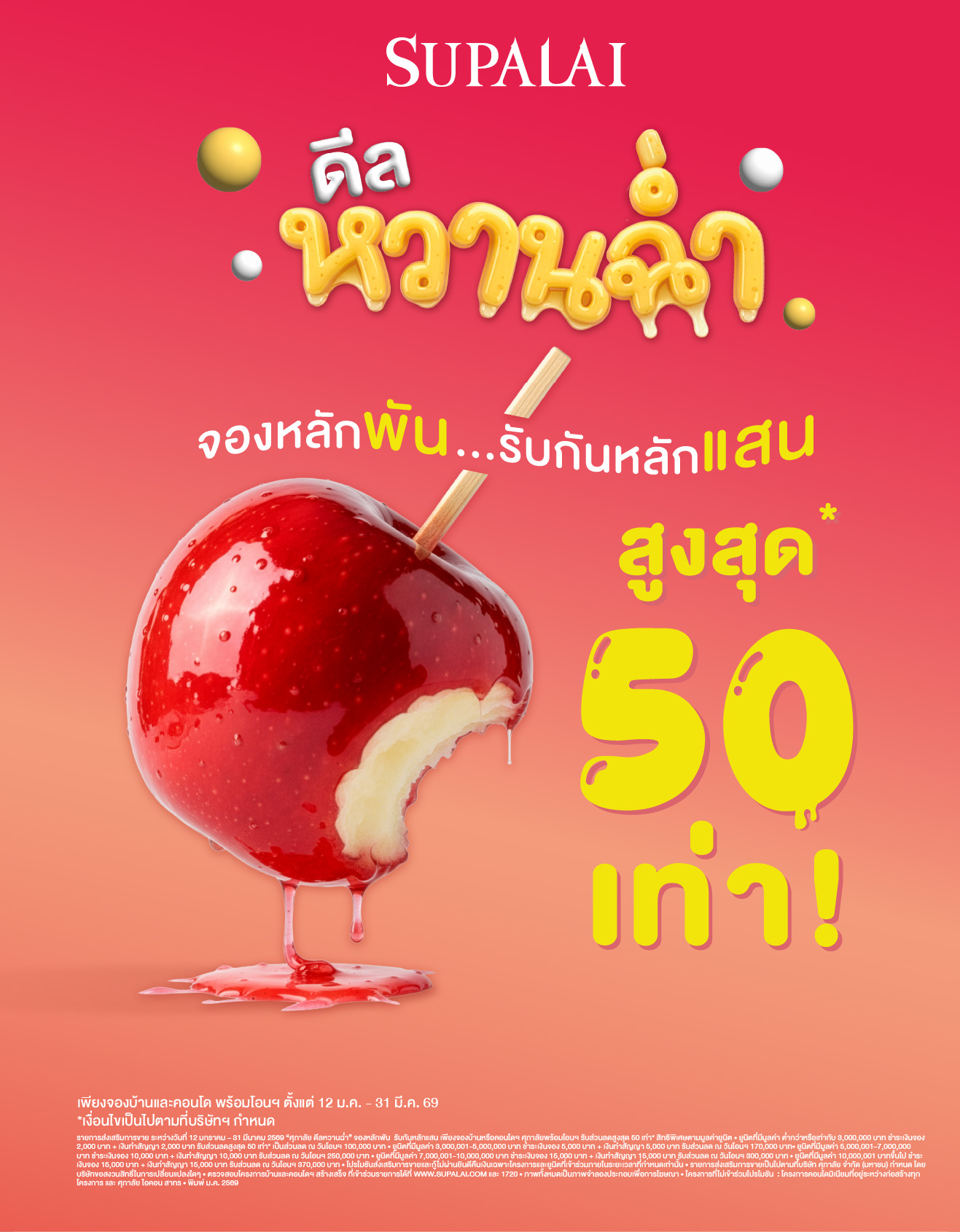 เตรียมตัวพบกับดีลหวานที่สุด ได้ตั้งแต่วันที่ 12 มกราคม – 31 มีนาคม 2569 นี้ ลูกค้าที่สนใจบ้านเดี่ยว บ้านแฝด ทาวน์โฮม และคอนโดมิเนียม สามารถเยี่ยมชมโครงการ ณ สำนักงานขายศุภาลัยทั่วประเทศ และสามารถตรวจสอบรายชื่อโครงการบ้านและคอนโดมิเนียมที่เข้าร่วมรายการได้ที่ www.supalai.com และ Facebook : Supalai หรือสอบถามข้อมูลเพิ่มเติมโทร.1720