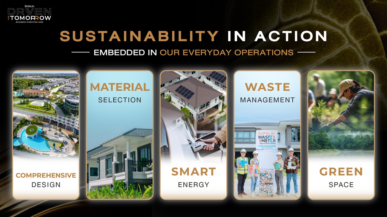 ทิศทางการขับเคลื่อนของศุภาลัยในปี 2569 ไม่ได้สะท้อนเพียงผ่านตัวเลขและแผนธุรกิจ แต่ต่อยอดด้วยแนวคิด Sustainability Driven ซึ่งเป็นฐานสำคัญของ Driven for Tomorrow ภายใต้กรอบแนวคิดเติบโตโดยไม่สร้างต้นทุนให้อนาคต โดยคำนึงถึงผลกระทบระยะยาวต่อสิ่งแวดล้อม ผู้อยู่อาศัย ผู้มีส่วนได้เสีย และความสามารถในการแข่งขันของบริษัทฯ ตั้งแต่กระบวนการออกแบบ ก่อสร้าง ส่งมอบ ไปจนถึงการบริหารโครงการ