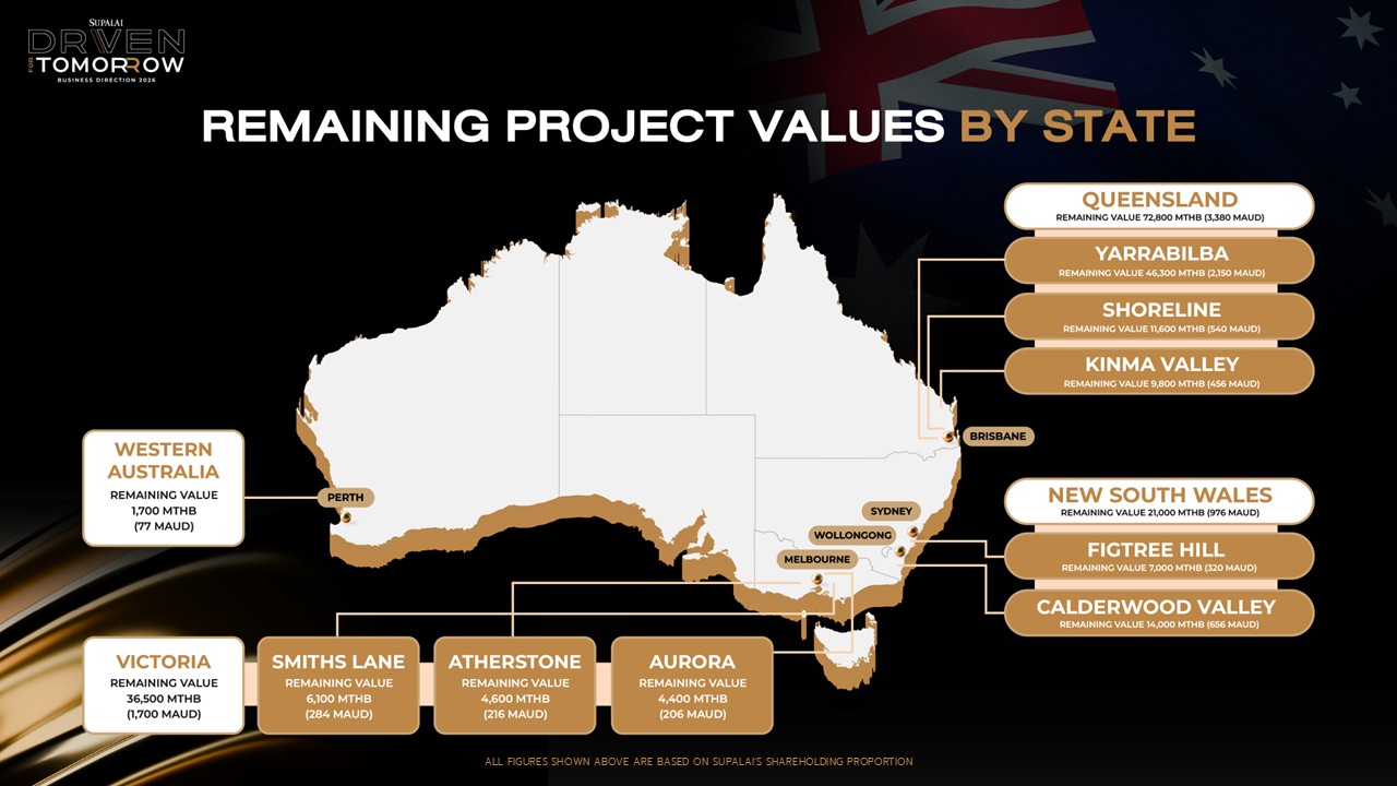 ในเชิงพอร์ตการลงทุน ปัจจุบันศุภาลัยกระจายการลงทุนในออสเตรเลียหลายรัฐ และในปี 2569 เตรียมเปิดใหม่ 1 โครงการในเมืองเมลเบิร์น ทำให้พอร์ตโครงการรวมอยู่ที่ 25 โครงการ ครอบคลุม 4 รัฐ 6 เมือง รวมมูลค่า 176,500 ล้านบาท* (ตามสัดส่วนการถือหุ้นของศุภาลัย) ซึ่งสะท้อนความพร้อมในการขยายการลงทุนอย่างเหมาะสมตามสภาพตลาดในแต่ละพื้นที่