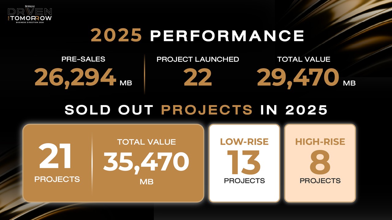โดยในปี 2568 ที่ผ่านมา บริษัทฯ มีโครงการปิดการขายแล้ว (Sold out) ภายในปี รวม 21 โครงการ มูลค่าโครงการ 35,470 ล้านบาท แบ่งเป็นโครงการแนวราบ 13 โครงการ และโครงการคอนโดมิเนียม 8 โครงการ และในปี 2569 นี้ บริษัทฯ ยังเตรียมเปิดตัวโครงการสำคัญ อาทิ “ศุภาลัย ลอฟท์ ท่าพระ อินเตอร์เชนจ์” และ “ศุภาลัย พรีมา วิลล่า รังสิต คลอง 3” พร้อมขยายการพัฒนาไปยังจังหวัดสุพรรณบุรีและเกาะ สมุย จังหวัดสุราษฎร์ธานี ครอบคลุม 30 จังหวัดทั่วประเทศ