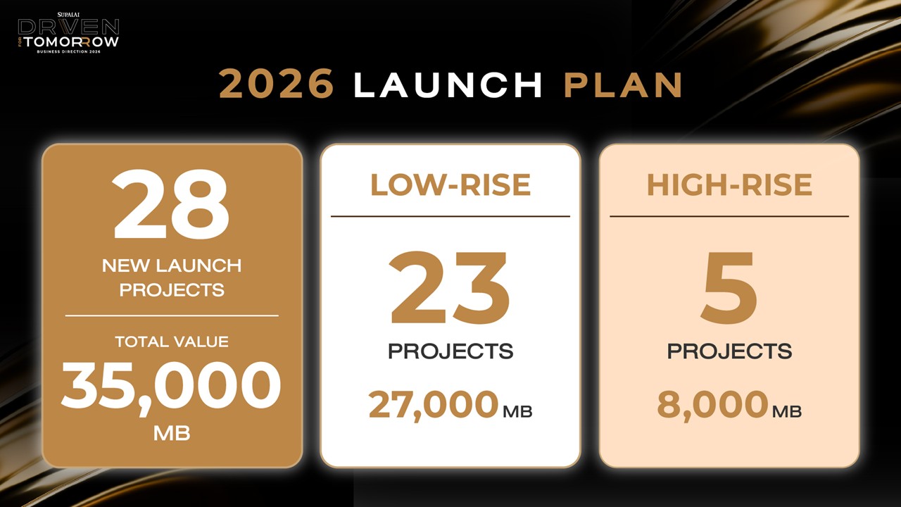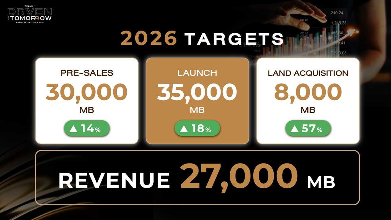 สำหรับปี 2569 ศุภาลัยกำหนดเป้าหมายการดำเนินงานผ่าน 3 ตัวชี้วัดหลัก ได้แก่ เป้าหมายยอดขายในประเทศไทย 30,000 ล้านบาท มูลค่าโครงการเปิดใหม่ 35,000 ล้านบาท และงบซื้อที่ดิน 8,000 ล้านบาท เพื่อสร้างความต่อเนื่องของพอร์ตโครงการ พร้อมวางแผนเปิดโครงการใหม่รวม 28 โครงการ ครอบคลุมทั้งกรุงเทพฯ–ปริมณฑลและภูมิภาค โดยบริหารพอร์ตให้สมดุลระหว่างโครงการแนวราบและคอนโดมิเนียม ด้านรายได้ในปีนี้ บริษัทฯ ตั้งเป้าหมายรับรู้รายได้ประมาณ 27,000 ล้านบาท โดยมีโครงการคอนโดมิเนียมพร้อมโอนกรรมสิทธิ์เป็นแรงขับเคลื่อนหลัก ได้แก่ ศุภาลัย ปาร์ค เอกมัย–พัฒนาการ, ศุภาลัย เซนส์ ศรีนครินทร์ และ ศุภาลัย คราม เขาเต่า รวมมูลค่า 6,080 ล้านบาท