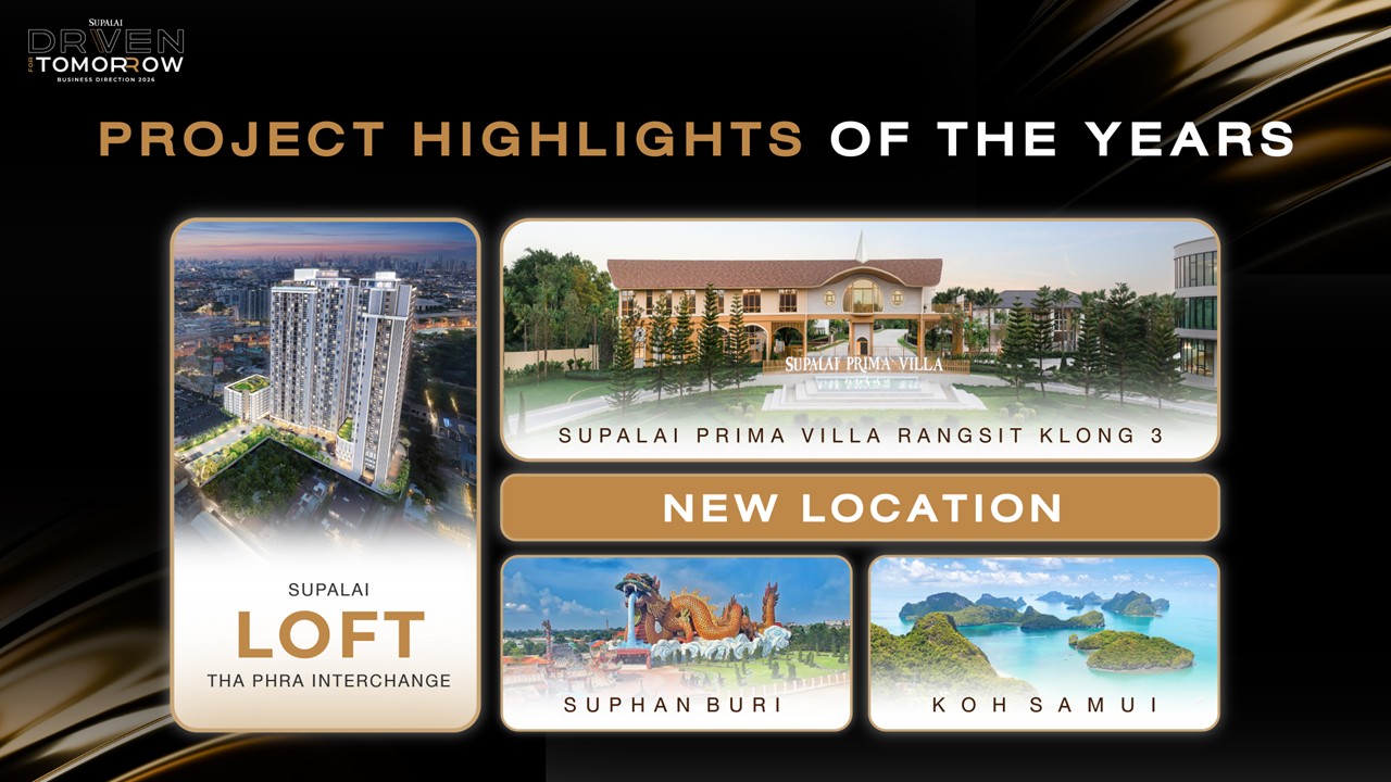 บมจ.ศุภาลัย ประกาศทิศทางธุรกิจปี 2569 ภายใต้แนวคิด Driven for Tomorrow ท่ามกลางเศรษฐกิจที่ยังขยายตัวในกรอบจำกัด พร้อมเดินหน้าธุรกิจอย่างมั่นคง ควบคู่การเติบโตอย่างยั่งยืน ผ่านการพัฒนาโครงการในทำเลและรูปแบบที่สอดคล้องกับกำลังซื้อของตลาด ตั้งเป้ายอดขายรวมทั้งในประเทศไทยและออสเตรเลียปี 2569 มูลค่า 45,000 ล้านบาท* พร้อมแผนเปิดโครงการใหม่ 28 โครงการ มูลค่า 35,000 ล้านบาท พร้อมลุยสุพรรณบุรีและเกาะสมุย เดินหน้าสร้างฐานรายได้ให้สมดุลมากขึ้นผ่านธุรกิจต่างประเทศ โดยเฉพาะตลาดอสังหาฯ ออสเตรเลียที่ปี 2568 เติบโตกว่า 370% พร้อมรุกธุรกิจคลังสินค้าให้เช่า ควบคู่ยกระดับองค์กรด้วย Data Driven และกรอบ Sustainability Driven มุ่งสู่ Carbon Neutrality ปี 2050