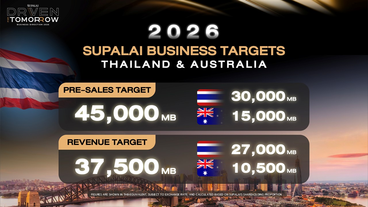 ศุภาลัยตั้งเป้ายอดขายรวมในปี 2569 ทั้งในประเทศไทยและประเทศออสเตรเลียที่ 45,000 ล้านบาท* แบ่งเป็นเป้ายอดขายในประเทศไทย 30,000 ล้านบาท และเป้ายอดขายจากประเทศออสเตรเลีย 15,000 ล้านบาท* ขณะเดียวกันบริษัทฯ ตั้งเป้ารายได้รวมทั้งสองประเทศที่ 37,500 ล้านบาท* โดยแบ่งเป็นตั้งเป้ารายได้ในประเทศไทย 27,000 ล้านบาท และเป้ารายได้จากประเทศออสเตรเลียประมาณ 10,500 ล้านบาท* โดยขับเคลื่อนการเติบโตอย่างสมดุล ผ่านการเพิ่มประสิทธิภาพโครงการพร้อมขาย เปิดตัวโครงการและขยายจังหวัดใหม่เพิ่มมากขึ้น รวมไปถึงการพัฒนาธุรกิจหลากมิติ ควบคู่ฐานะการเงินที่แข็งแกร่ง ด้วยสินทรัพย์รวมกว่า 98,000 ล้านบาท เครดิตเรตติ้งระดับ A ต่อเนื่อง 12 ปีซ้อน พร้อมต้นทุนทางการเงินต่ำ สะท้อนความพร้อมในการเติบโตอย่างมั่นคงและยั่งยืน