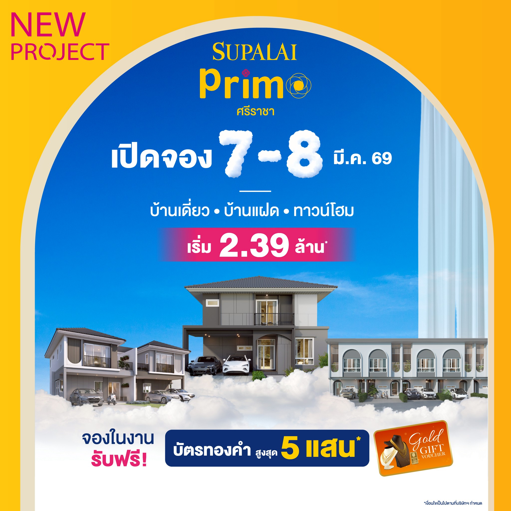 เตรียมพบกับการเปิดจองครั้งแรกอย่างเป็นทางการในวันที่ 7-8 มีนาคม 2569 นี้ กับโอกาสเป็นเจ้าของก่อนใคร พร้อมข้อเสนอพิเศษเฉพาะ 2 วันเท่านั้น! รับ Voucher ทองคำสูงสุด 500,000 บาท* ราคาเริ่มต้นเพียง 2.39 ล้านบาท* สำหรับผู้ที่กำลังมองหาบ้านดีไซน์ใหม่บนทำเลศักยภาพศรีราชา นี่คือจังหวะที่ไม่ควรพลาด ลงทะเบียนรับสิทธิพิเศษวันงาน https://supalai.ly/4qotpDX และสอบถามรายละเอียดเพิ่มเติมได้ที่ โทร. 1720, www.supalai.com หรือ Facebook: Supalai และ ศุภาลัย ชลบุรี ศรีราชา พัทยา (*เงื่อนไขเป็นไปตามที่บริษัทฯ กำหนด)