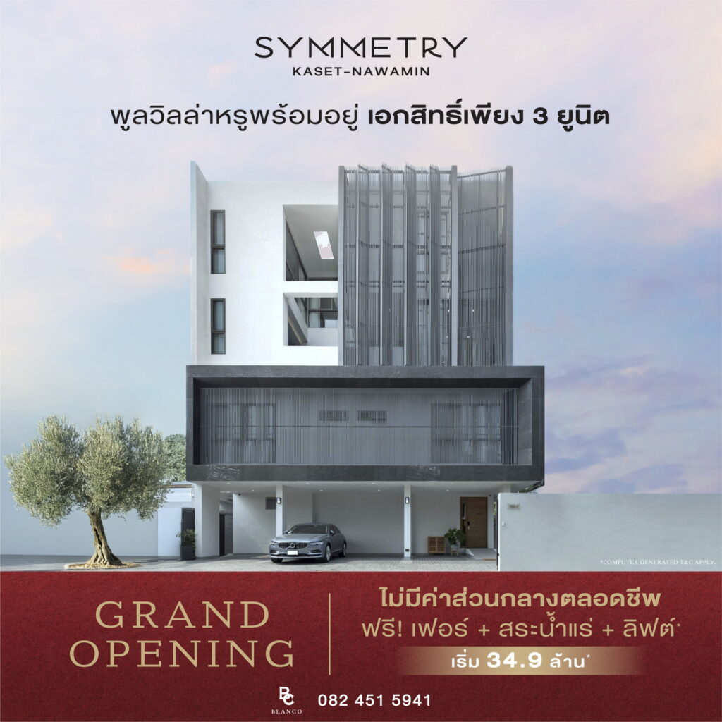 โครงการ 𝗦𝗬𝗠𝗠𝗘𝗧𝗥𝗬 Kaset-Nawamin (ซิมมิทรี เกษตร-นวมินทร์) วางคอนเซ็ปต์การพัฒนาให้เป็นบ้านหรู สไตล์ Modern Luxury สูง 4 ชั้น ที่สะท้อนความเรียบหรูที่เหนือระดับ คัดสรรในทุกรายละเอียด ตั้งแต่ความพิเศษของวัสดุ เฟอร์นิเจอร์ ของตกแต่ง และสามารถปรับเปลี่ยนฟังก์ชั่นภายในได้ตามความต้องการของผู้อยู่อาศัย ไม่ว่าจะเป็นที่อยู่อาศัย สตูดิโอส่วนตัว หรือปรับเป็นพรีเมียมโฮมออฟฟิศ รองรับธุรกิจและสอดรับกับไลฟ์สไตล์ได้หลากหลาย ตอบโจทย์แนวคิดการสร้างสมดุลการทำงาน Work Life Balance ของคนรุ่นใหม่ได้อย่างลงตัวที่สุด เพิ่มความเอ็กซ์คลูซีฟมากยิ่งขึ้น กับการออกแบบให้ทุกยูนิตมีสระน้ำแร่ส่วนตัว ปลอดสารเคมี ดีต่อสุขภาพ พร้อมพื้นที่พักผ่อนส่วนตัวที่เชื่อมต่อกับสวนสวยภายในบริเวณบ้าน ลิฟต์ส่วนตัวแบบ Common จุได้ 8 คน รองรับน้ำหนักได้ 630 กิโลกรัม ระบบ Home Automation ไม่มีค่าส่วนกลางรายปี และมอบความเป็นส่วนตัวขั้นสูงสุด กับการออกแบบให้มีเพียง 3 ยูนิตเท่านั้น กับบ้านเลขที่มังกร ขึ้นต้นด้วย 789 ทุกหลัง (มีความหมายมั่งคั่งร่ำรวย ดึงดูดความสำเร็จโชคลาภไม่ขาดสาย) ในราคา 34.9 – 40 ล้านบาท*