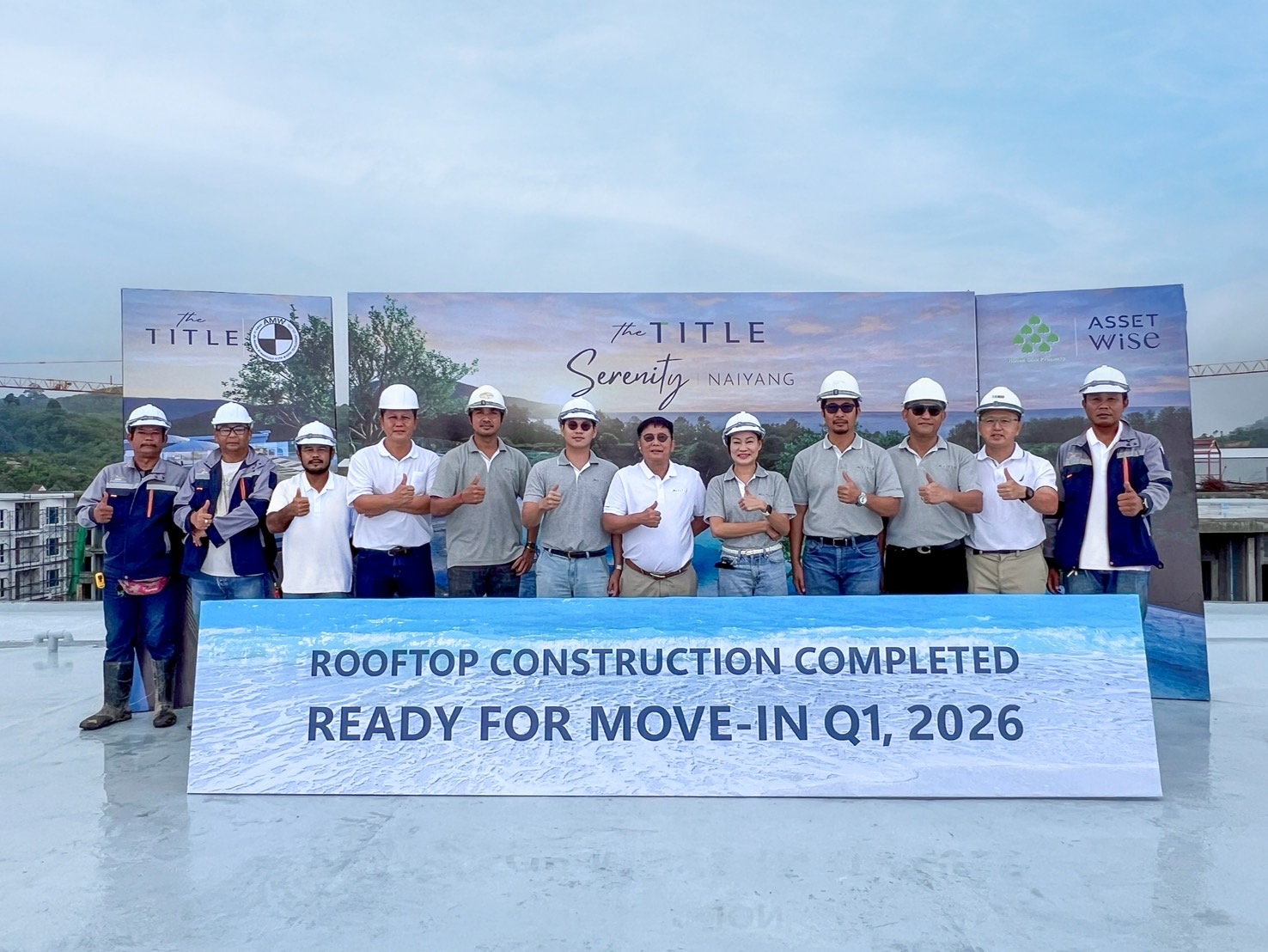 คุณดรงค์ หุตะจูฑะ (ที่ 7 จากซ้าย) ประธานเจ้าหน้าที่บริหาร บริษัท ร่มโพธิ์ พร็อพเพอร์ตี้ จำกัด (มหาชน) หรือ TITLE ผู้พัฒนาอสังหาริมทรัพย์ Leisure Residence เพื่อการพักอาศัยและการลงทุนอย่างยั่งยืน พร้อมด้วย คุณอาคม ศรีสัจจะธร (ที่ 11 จากซ้าย) กรรมการผู้จัดการ บริษัท เอ เอ็ม ดับเบิลยู ดีเวลลอปเม้นท์ จำกัด ผู้รับเหมาคุณภาพ ร่วมปิดงานก่อสร้างชั้นดาดฟ้า และสระว่ายน้ำบนชั้นดาดฟ้า Rooftop Pool รวมถึงเข้าตรวจความเรียบร้อยงานก่อสร้างคอนโดมิเนียม โครงการเดอะ ไทเทิล เซเรนิตี้ ในยาง (The Title Serenity Naiyang) คอนโดมิเนียมใกล้หาดในยาง และอุทยานแห่งชาติสิรินาถ เพียง 400 เมตร มาพร้อมนิยามการอยู่อาศัยแบบ “Privileged Life beside A National Park” โดยขณะนี้ได้ก่อสร้างในส่วนโครงสร้างหลักเสร็จสมบูรณ์เป็นที่เรียบร้อยตามกำหนด พร้อมให้ลูกค้าโอนกรรมสิทธิ์ได้ในช่วงไตรมาส1/2569 ซึ่งปัจจุบันโครงการฯ สามารถทำยอดขายไปได้แล้วกว่า 70 % โดยมีทีมผู้บริหาร และพนักงานร่วมงาน เมื่อเร็ว ๆ นี้ ณ โครงการเดอะ ไทเทิล เซเรนิตี้ ในยาง จ.ภูเก็ต